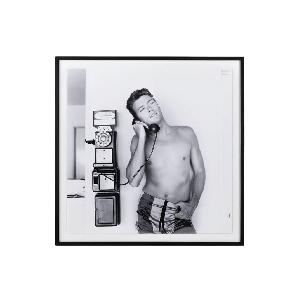 Actor Clint Eastwood photographed in Los Angeles in 1956. Float-mounted and framed within black-finished American maple for a museum-quality look. Image courtesy of Getty Images' Michael Ochs Archives. Handmade in Austin, Texas, each print includes a certificate of authenticity commemorating the exclusive partnership between Getty Images and Four Hands Art Studio.