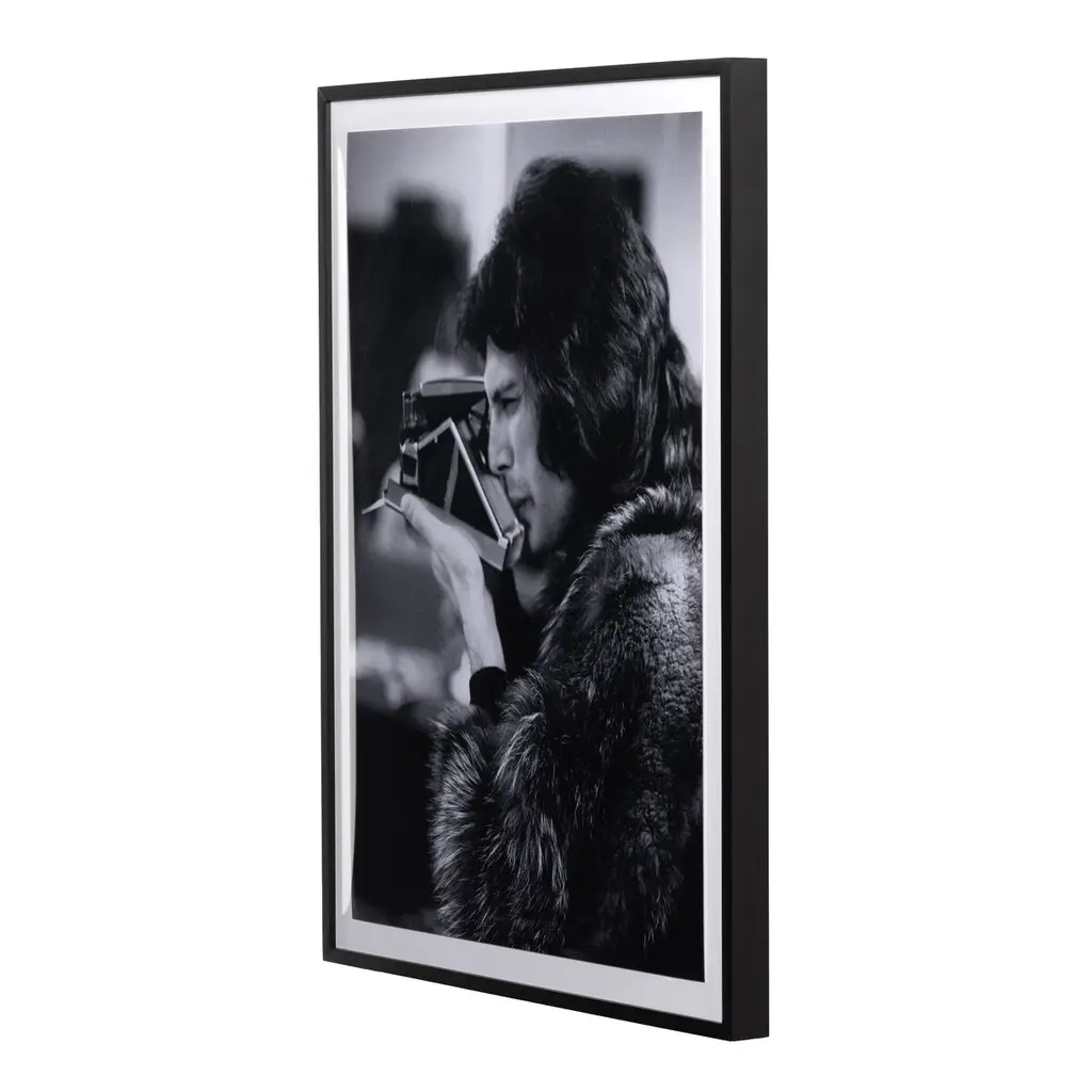 Iconic Queen singer Freddie Mercury snaps a Polaroid. Float-mounted and framed within black-finished maple for a museum-quality look. Image courtesy of Getty Images' Michael Ochs Archives. Handmade in Austin, Texas, each print includes a certificate of authenticity commemorating the exclusive partnership between Getty Images and Four Hands Art Studio.