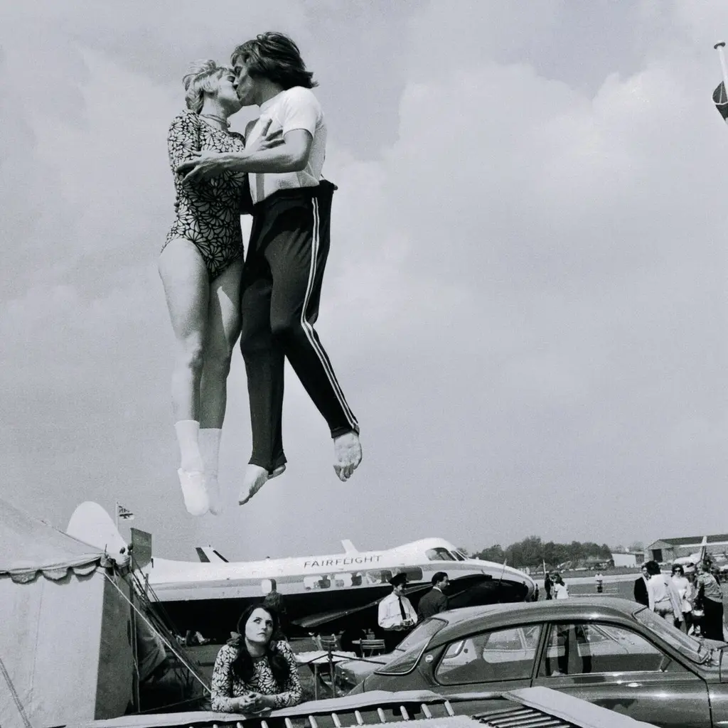 A mid-air kiss. Married world trampolining champions Paul Luxon and Ute Czech, photographed at the Biggin Hill Air Fair in 1973. A high-definition metal print produced on ChromaLuxe using dye sublimation print technology and float-mounted in a vertical grain floater frame of white-finished American oak for a modern, museum-quality look. Photo by Chris Ware, courtesy of Getty Images.