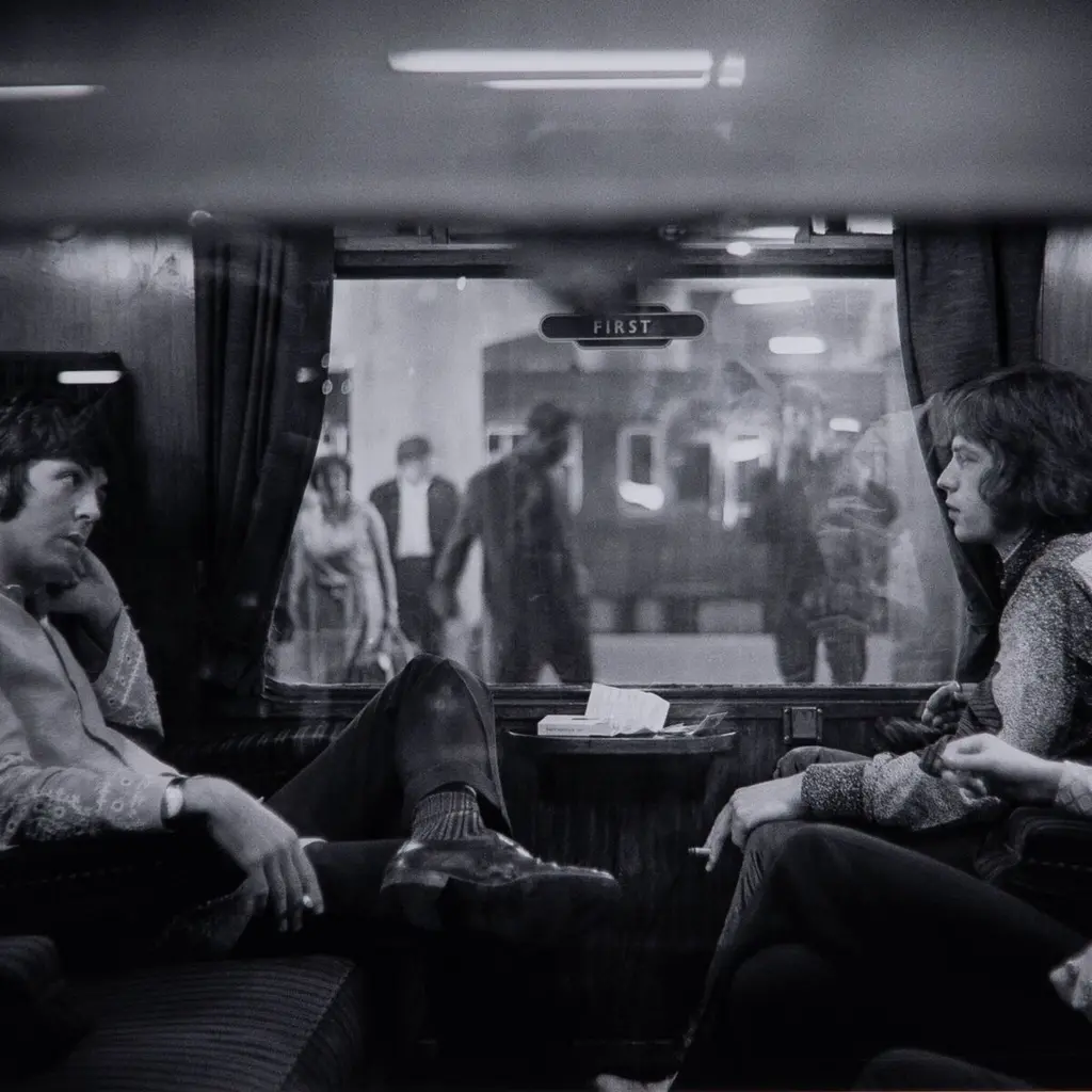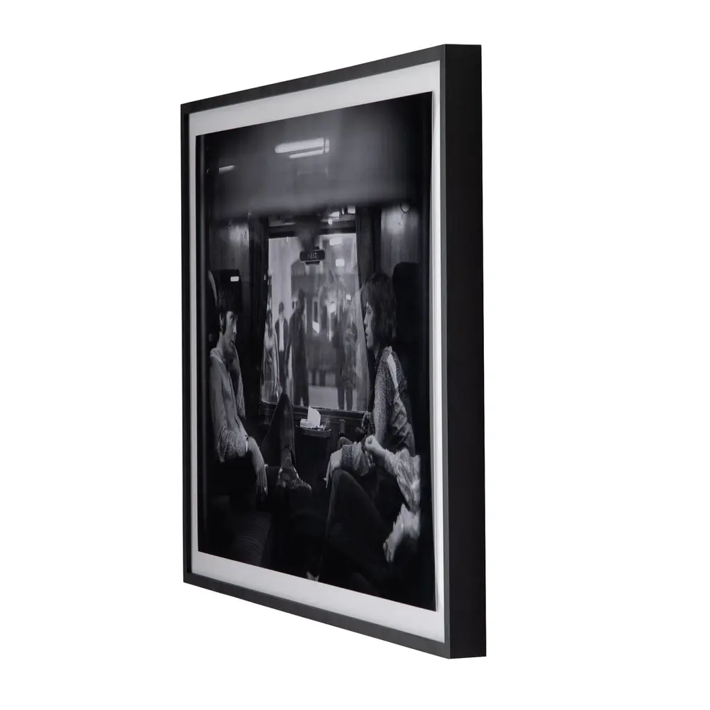 Renowned rock stars Paul McCartney and Mick Jagger, photographed at Euston Station in 1967 by Victor Blackman, courtesy of Getty Images. Float-mounted and framed within black-finished American maple for a museum-quality look. Handmade in Austin, Texas, each print includes a certificate of authenticity commemorating the exclusive partnership between Getty Images and Four Hands Art Studio.