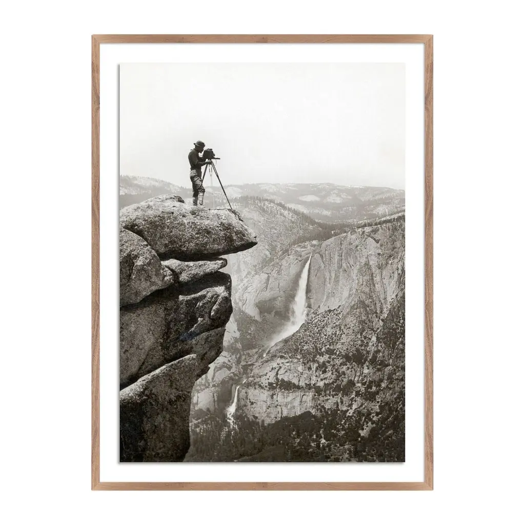 On the edge. A photographer captures Yosemite Valley in California. Courtesy of Getty Images. Printed on premium photo paper and float-mounted within a frame. Handmade in Austin, Texas, each print includes a certificate of authenticity commemorating the exclusive partnership between Getty Images and Four Hands Art Studio.