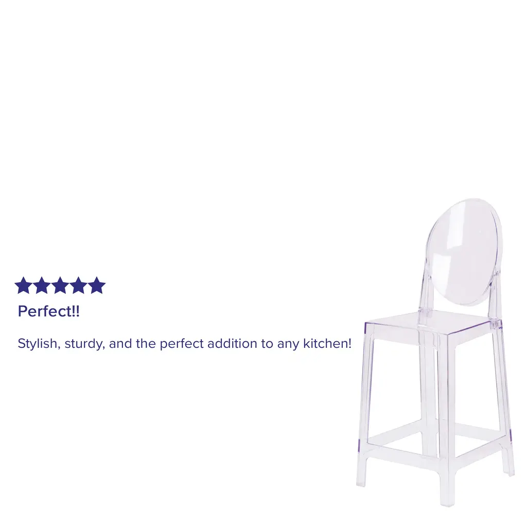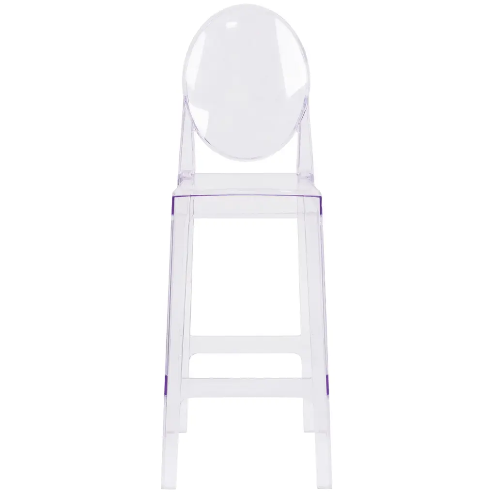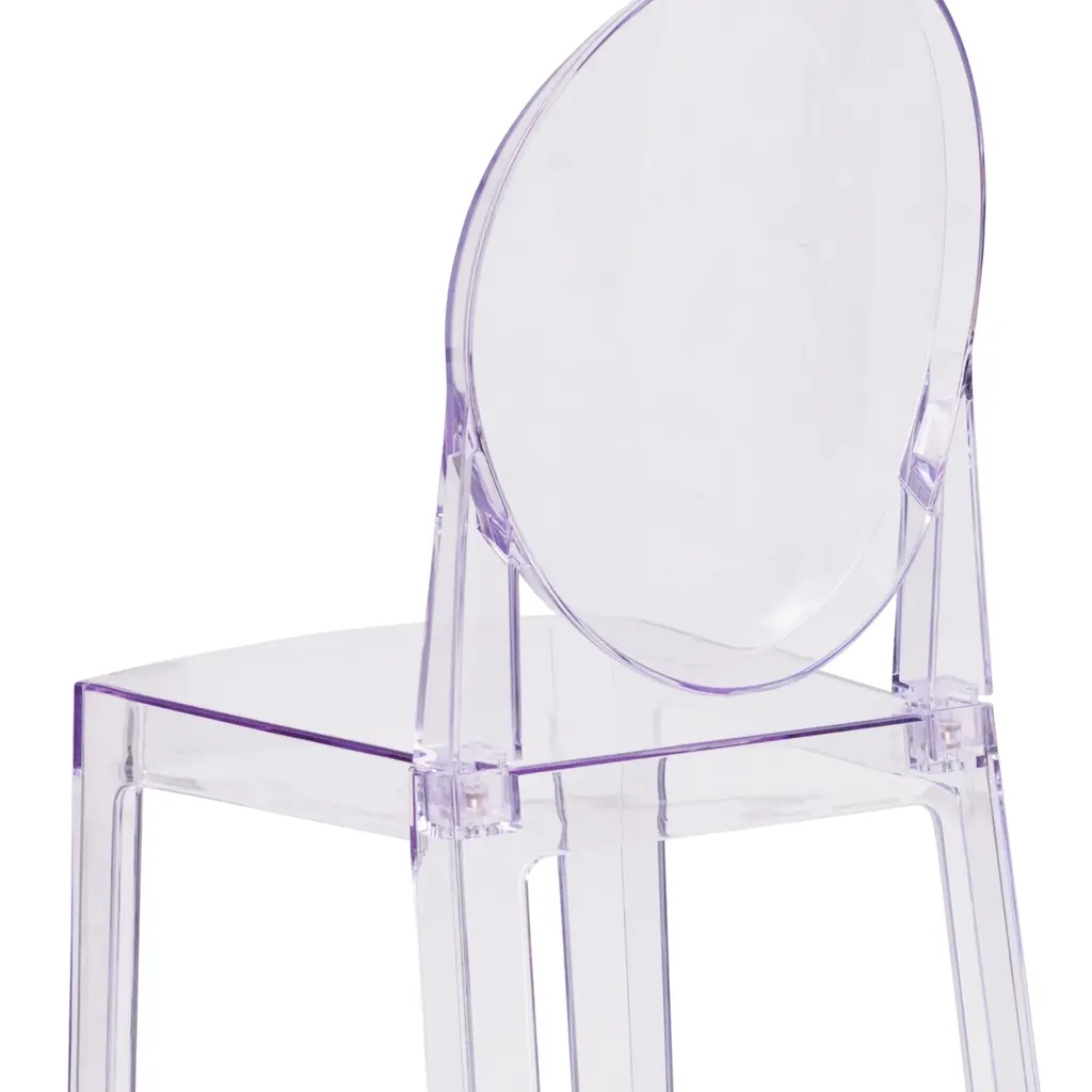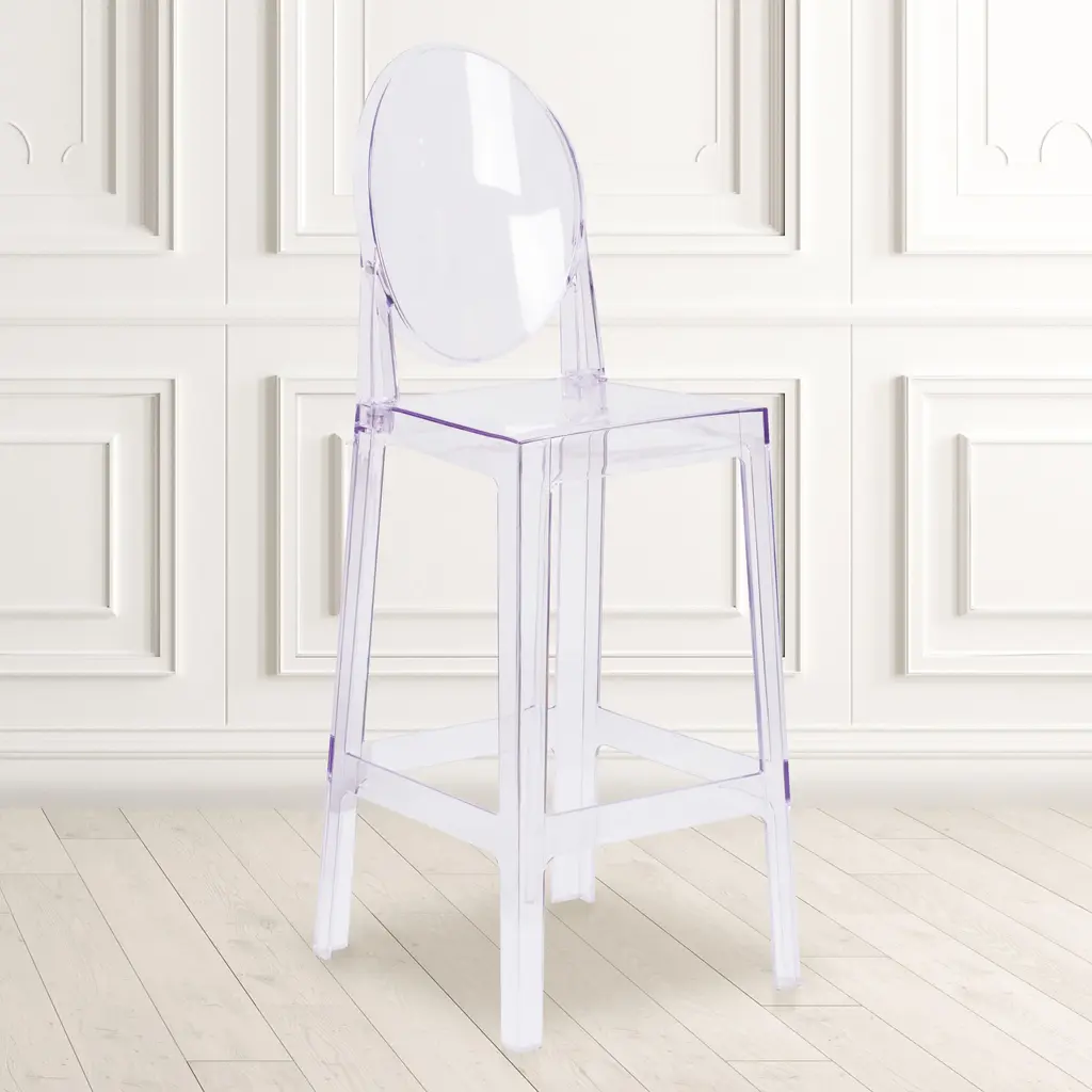 The transparent barstool brings modern design, elegance and function to your home, restaurant and special events.This modern stool with its near invisibility highlights your artwork and other furniture, lightens a crowded space and can make a small room appear larger. The contoured, polycarbonate molded seat provides comfort. Protective floor glides protect your floor by sliding smoothly when you need to move these beautiful chairs.This beautiful chair will become your premier choice for both indoor and outdoor events. Coordinate your ghost chairs with ghost barstools for an elegant and diverse appeal.