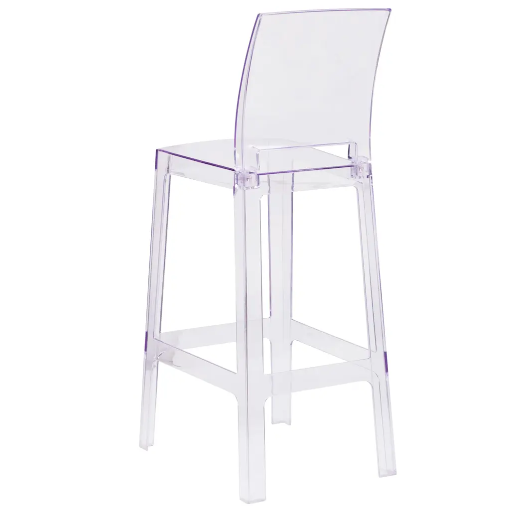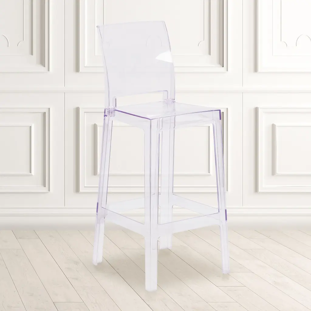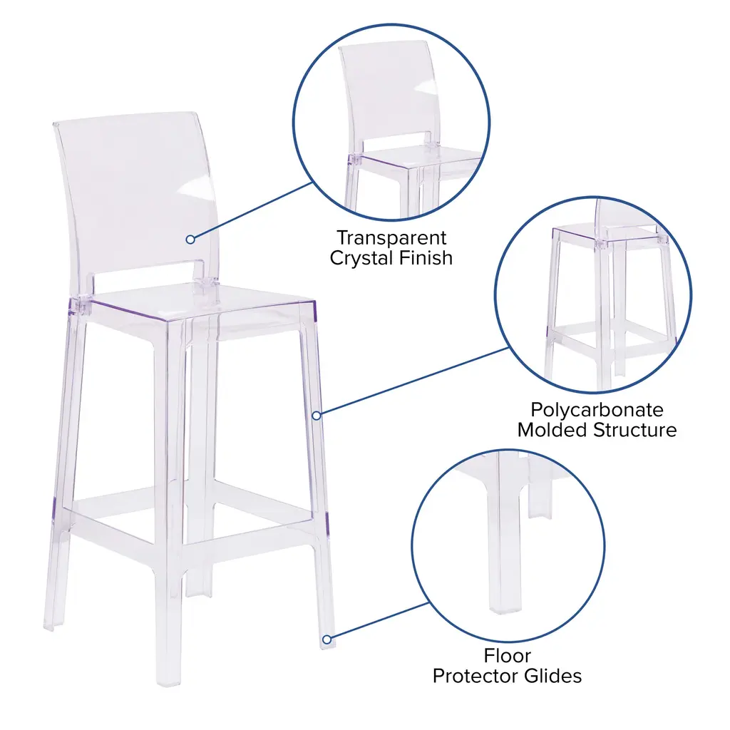The transparent barstool brings modern design, elegance and function to your home, restaurant and special events.This modern stool with its near invisibility highlights your artwork and other furniture, lightens a crowded space and can make a small room appear larger. The contoured, polycarbonate molded seat provides comfort. Protective floor glides protect your floor by sliding smoothly when you need to move these beautiful chairs.This beautiful chair will become your premier choice for both indoor and outdoor events. Coordinate your ghost chairs with ghost barstools for an elegant and diverse appeal.