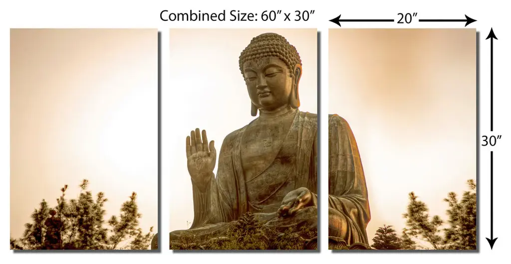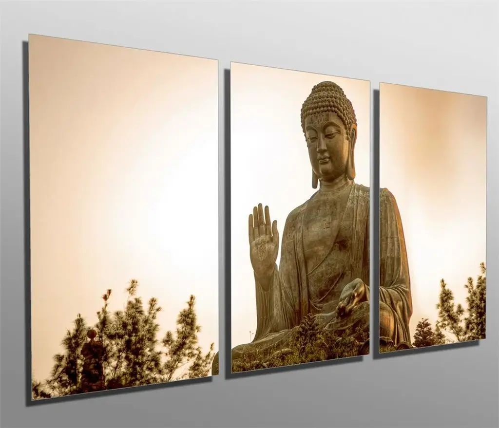 48"œ x 24"œ total size. Ready To Hang! (3 pieces - 16"œ x 24"œ each). 3 Panel Split (Triptych) Metal Print featuring a Giant Buddha Statue. Modern metal wall art for home or office wall decor & interior design. Printed on Luxurious, HD aluminum glossy metal panels. Multi panel art.. HD aluminum panels. Metal print wall art. Includes Shadow Wall Mount on the back.• Aluminum Metal Wall Art• Made in USA• Ready to hang - No assembly required• Shadow mount hardware on the back• 0.045"œ thick HD Aluminum Panels• Scratch resistant, glossy finish• Superb color clarity, luxurious prints• Epson printing process• For indoor or moisture rich environment use• Easy to clean. Gently wipe with microfiber cloth.