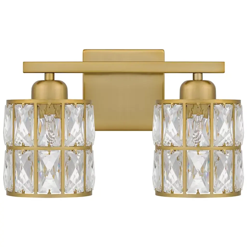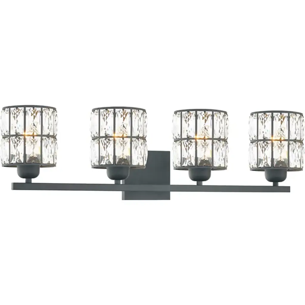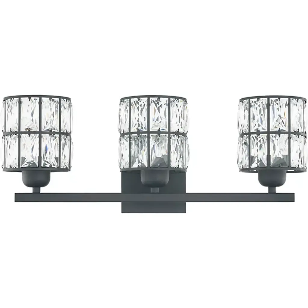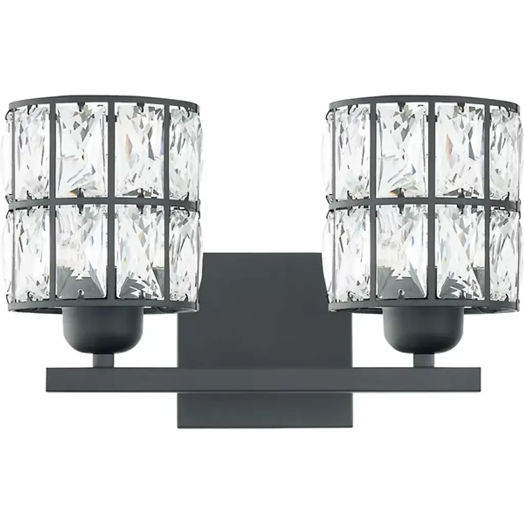 Brilliant, glamorous, refined. Energize your bathrooms with the dazzling crystal wrapped light sources of the Gibson Vanity Light from Quoizel. Mount it with shades facing up or down to complement the composition of your bathroom. Neat lamp holders and a sleek crossbar underline the piece’s modern sense. An intricate metal framework follows on top, covered in panels of crystals. These multi-faceted crystals captivate in their refracting properties with the faintest hint of ambient light. The crystals are set ablaze with rich highlights as incandescent bulbs beam through for a clean, diffused glow.