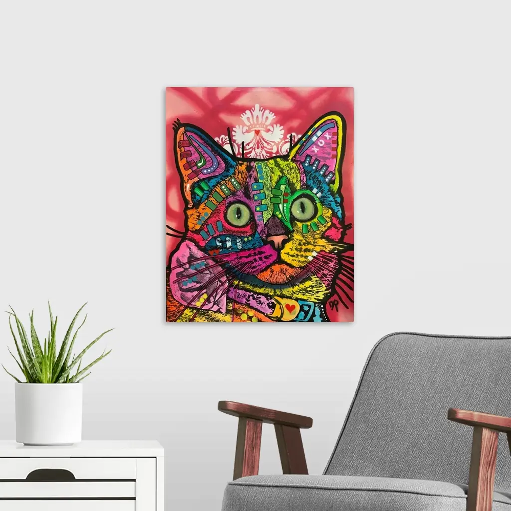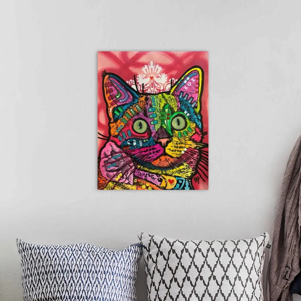 Contemporary stencil painting of a cat filled with various colors and patterns.