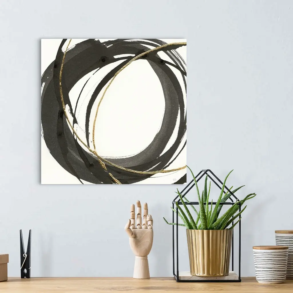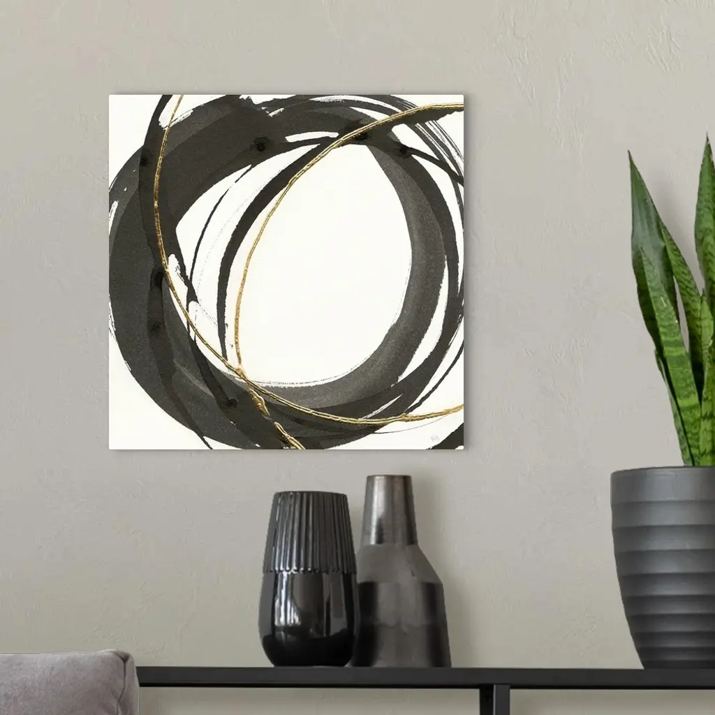 Abstract painting with black and gold circles layered on top of each other on a white, square background.