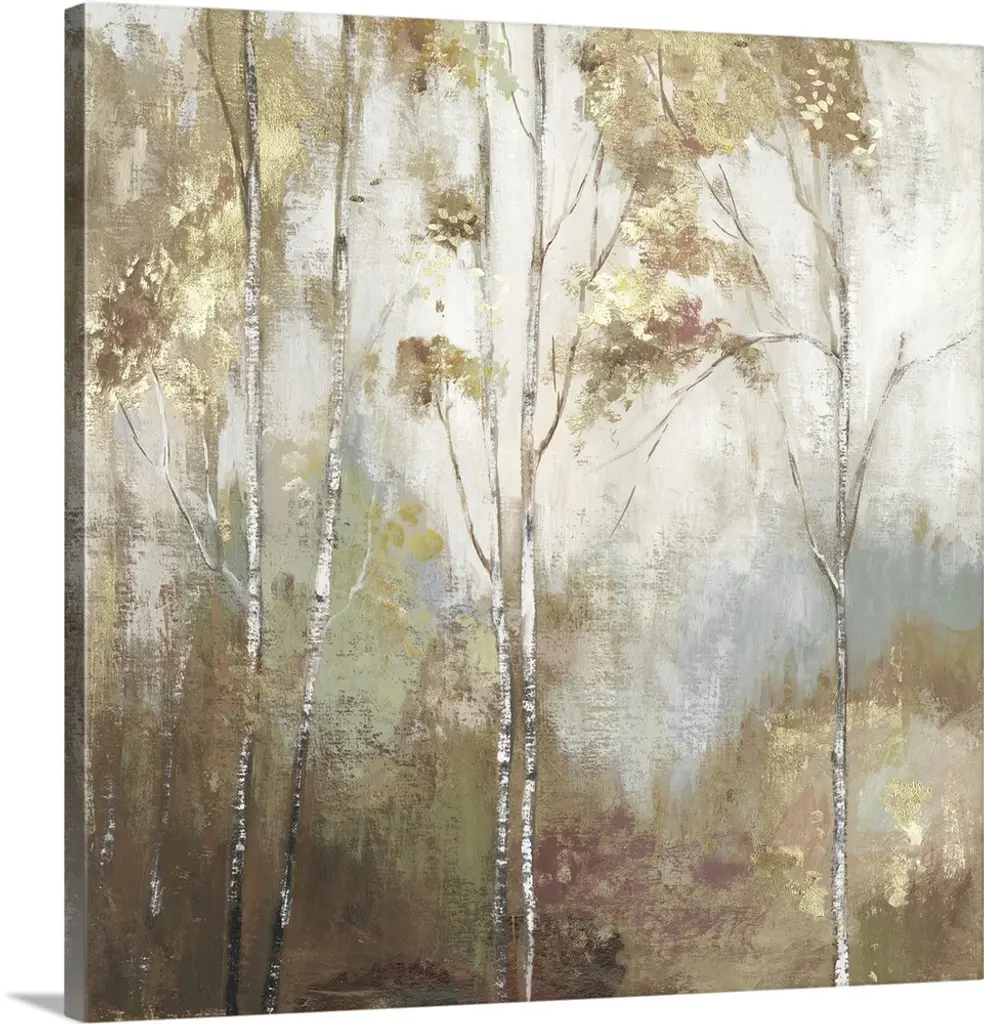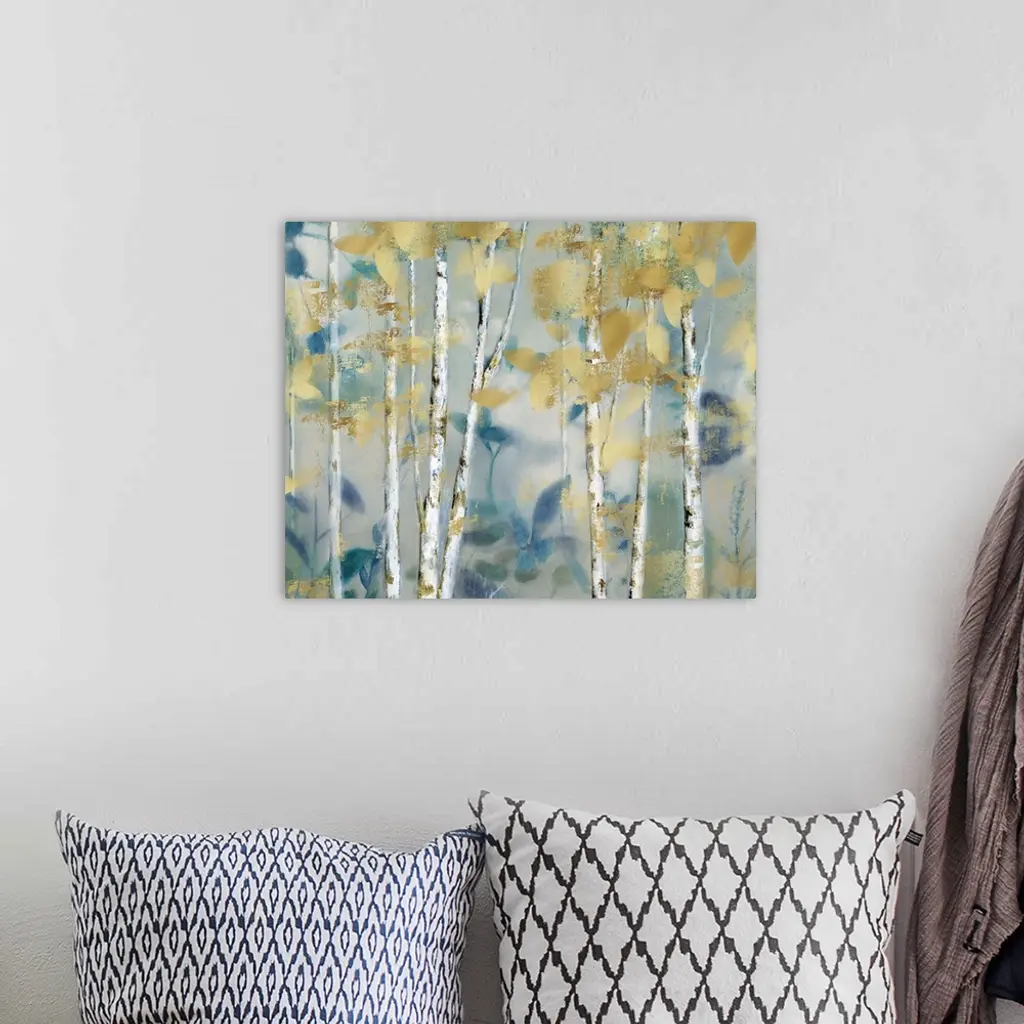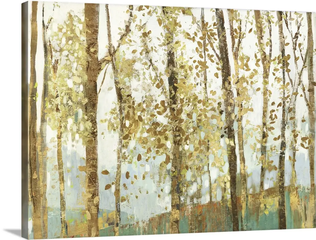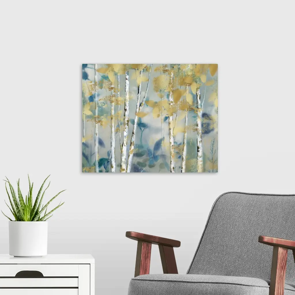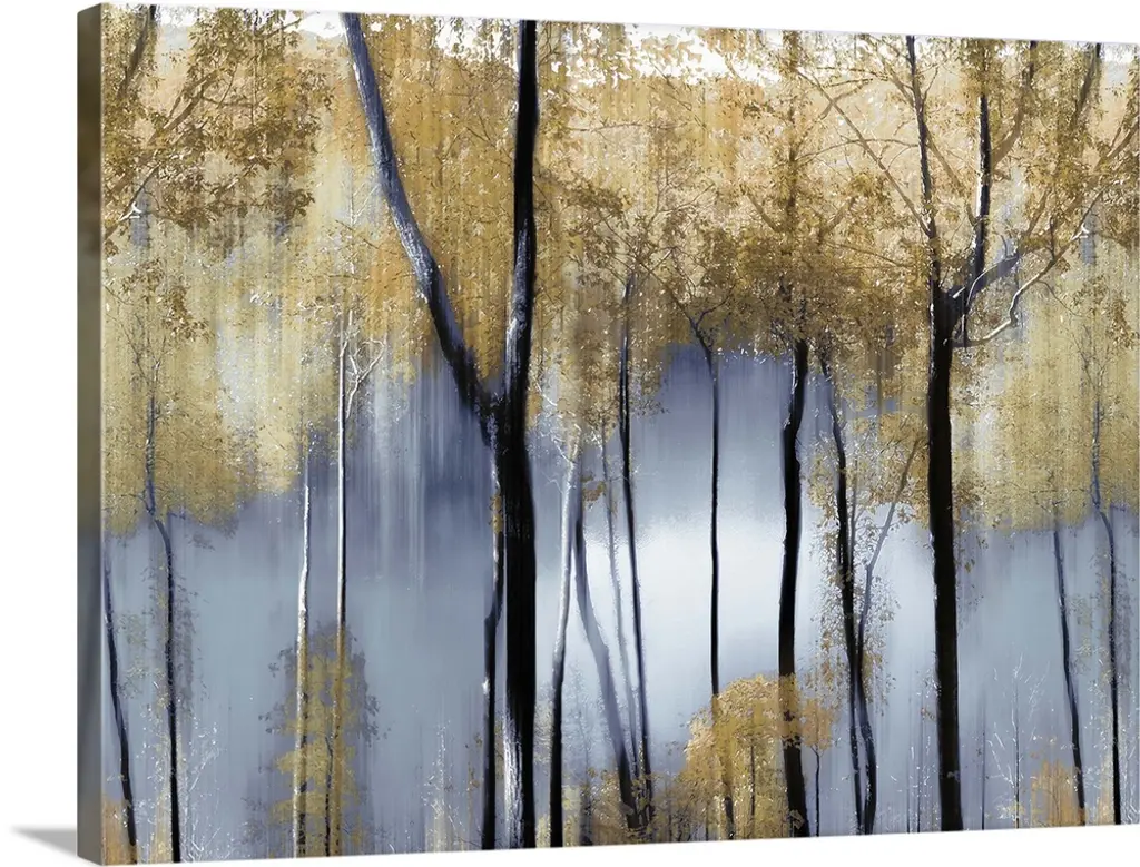 Abstract painting of a forest filled with gold and blue toned leaves.