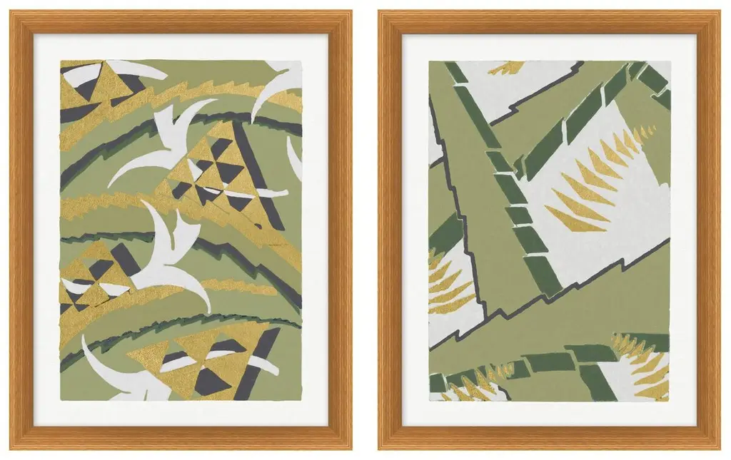 Each of these bold works of art is printed on matte paper, embellished with hand-applied gold leaf, and displayed under glass in a satin gold frame. Arrives ready to hang.