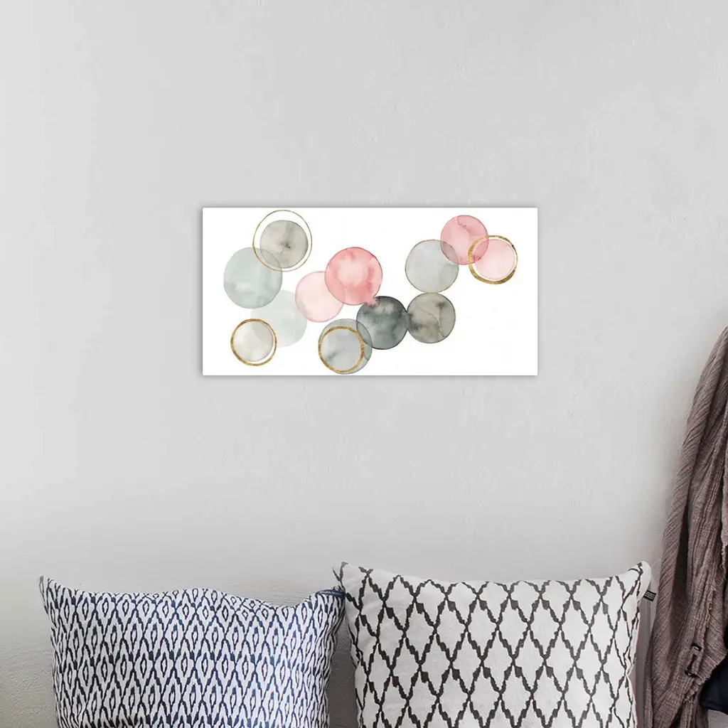 Contemporary abstract painting with watercolored circles connecting together in shades of gray and pink, with metallic gold circular outlines on top.