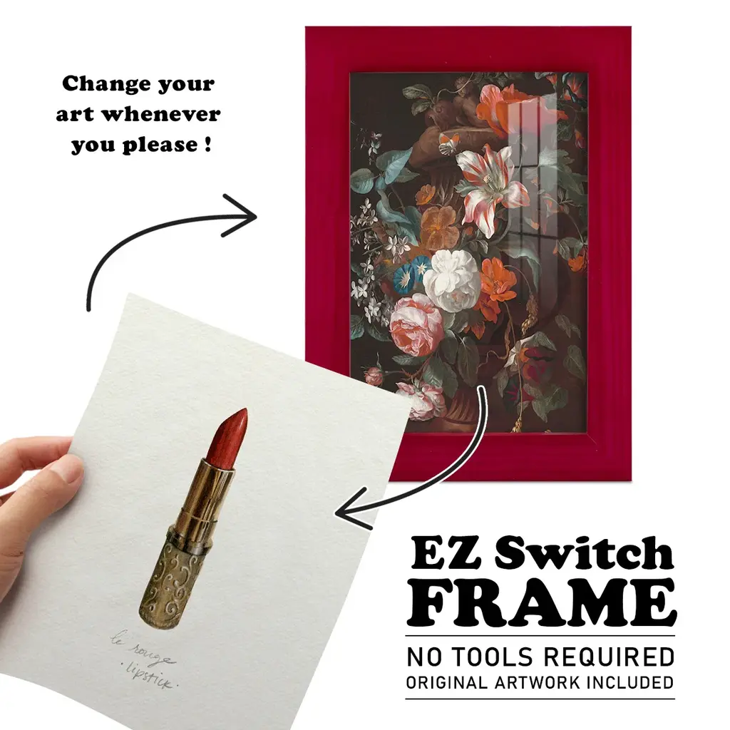 Gilded Toiletries III -EZ SWITCH Framed Print w/glass-Cherry Red A delightful, framed print. Featuring a solid wood frame with real wood glass. This premium print is giclee quality. In addition, every frame features a removable back and table top stand. This allows you to change your art in the future or to just stand the art on a table for a new look. We are sure you'll enjoy our new series of EZ SWITCH Framed Art. Solid Wood Frame Real Glass Removable / Replaceable Art Built in Tabletop Stand Sizes range from 4x6 up to 12x15 - buy just one or pair them up as sets as you see fit.
