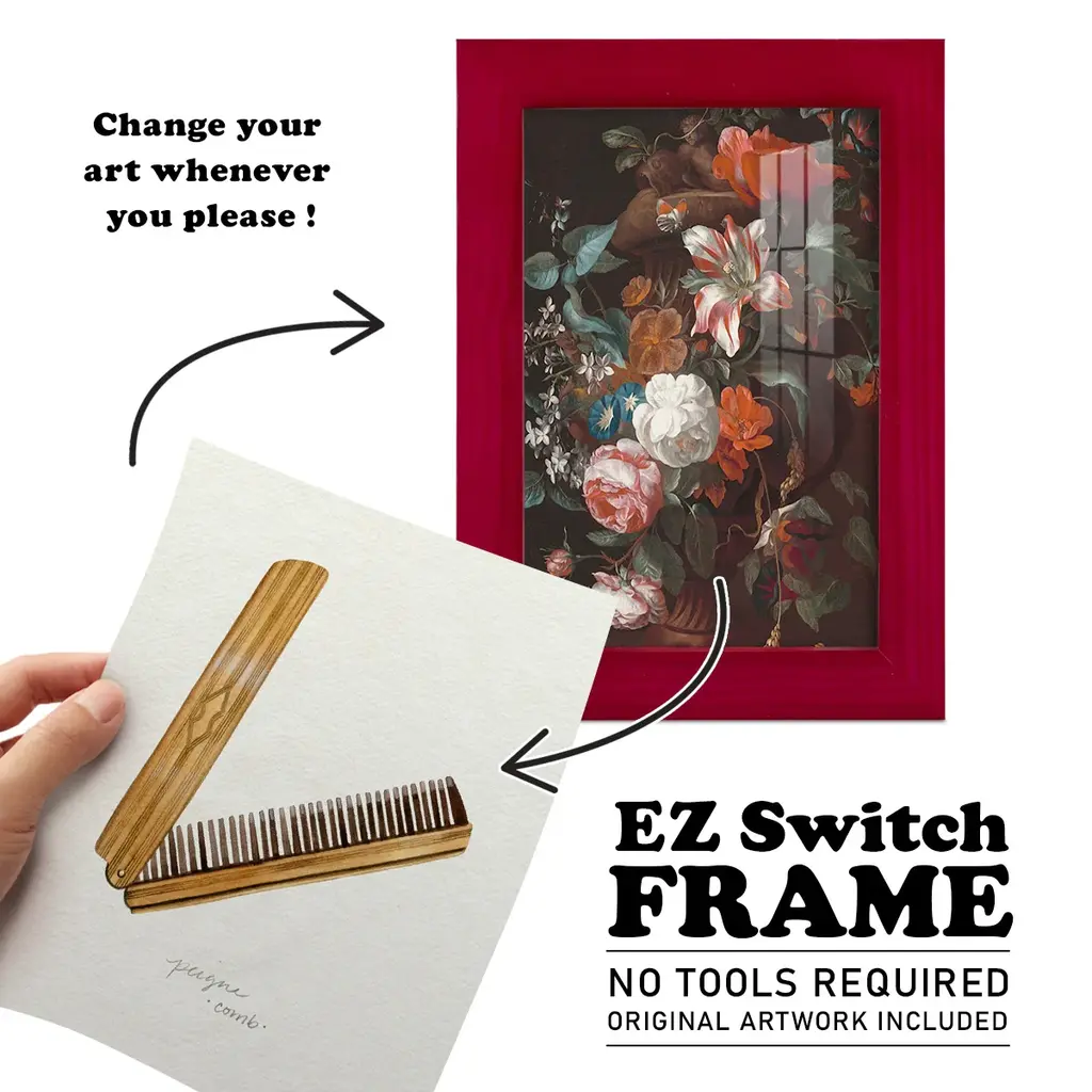 Gilded Toiletries IV -EZ SWITCH Framed Print w/glass-Cherry Red A delightful, framed print. Featuring a solid wood frame with real wood glass. This premium print is giclee quality. In addition, every frame features a removable back and table top stand. This allows you to change your art in the future or to just stand the art on a table for a new look. We are sure you'll enjoy our new series of EZ SWITCH Framed Art. Solid Wood Frame Real Glass Removable / Replaceable Art Built in Tabletop Stand Sizes range from 4x6 up to 12x15 - buy just one or pair them up as sets as you see fit.