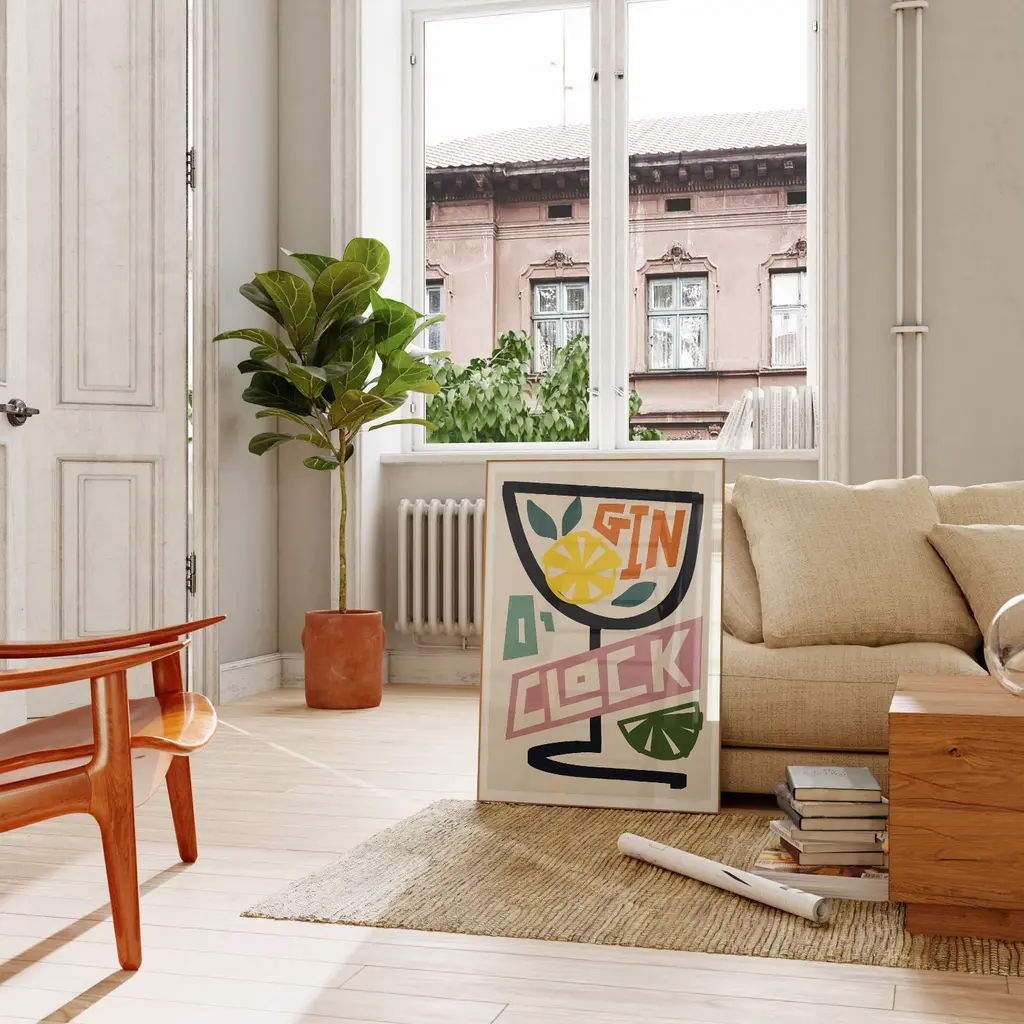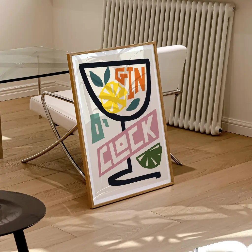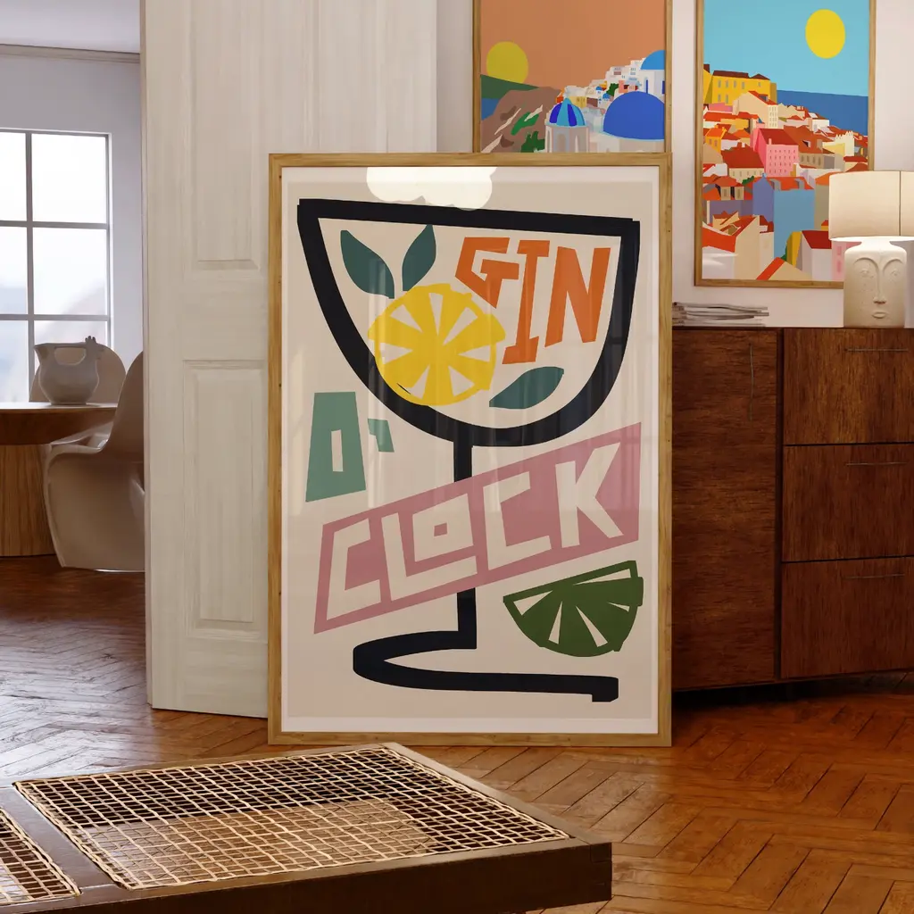 Gin O' Clock Art Print - A2Whether as a gift for a gin enthusiast or a statement piece for your own collection, our Gin Print is a must-have piece. Featuring a sleek design and vivid colors, this print is the perfect addition to a bar cart. All prints are digitally designed by myself and printed to order.Smooth fine art 230 gsm matte card. Printed with vivid colour and detail. Sold without a frame.