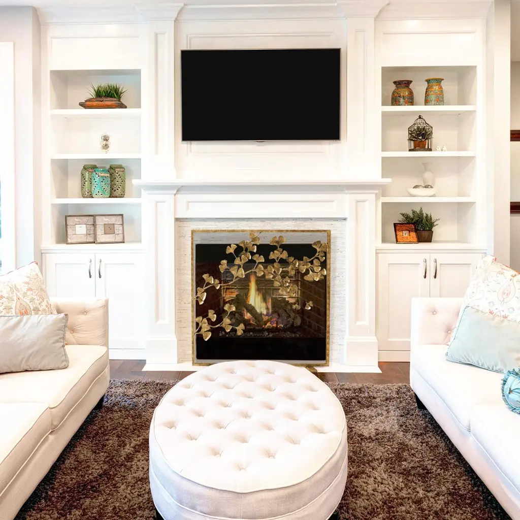 The Ginkgo Fireplace Screen is designed to be seen. This piece combines movement, elegance, and allure to make it the perfect piece to finish off your fireplace decor. Each leaf is formed with individual, hand bent iron. Inspired by Ginkgo trees and leaves, the Ginkgo Fireplace Screen will add elegance to your living room or bedroom. The Ginkgo Fireplace Screen is a stunning, one-of-a-kind fireplace screen with unparalleled movement.The Ginkgo Fire Screen can be finished in a variety of colors that can be paired with any color palette or complement existing design elements. Create an elegant and inviting space - the perfect setting for enjoying drinks or socializing with friends. As the fire roars behind the screen, it will protect from stray embers with its mesh backing while also serving as a timeless piece of artwork.Each piece is unique, with slight variations, due to the artisan nature of our hand-applied finishing process. Handmade in the U.S.A., it ships in 6-8 weeks.