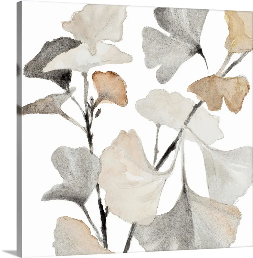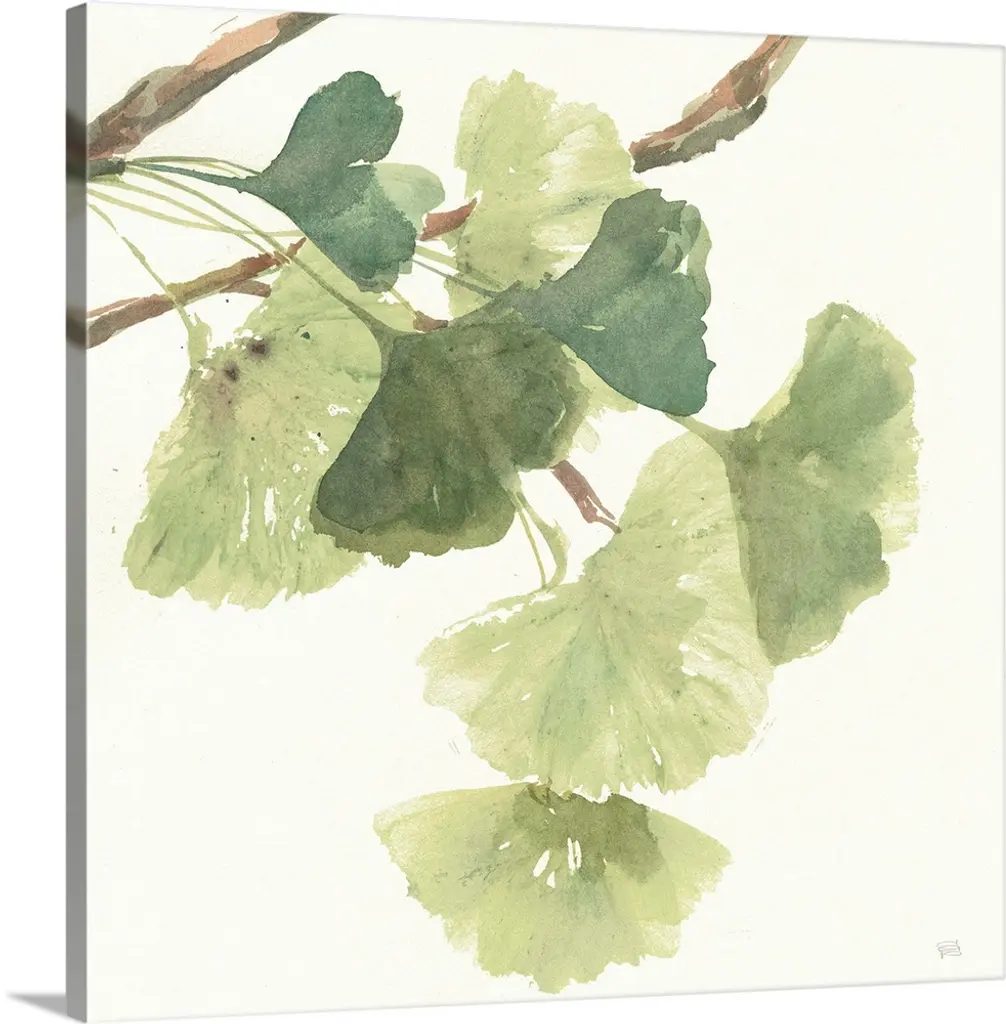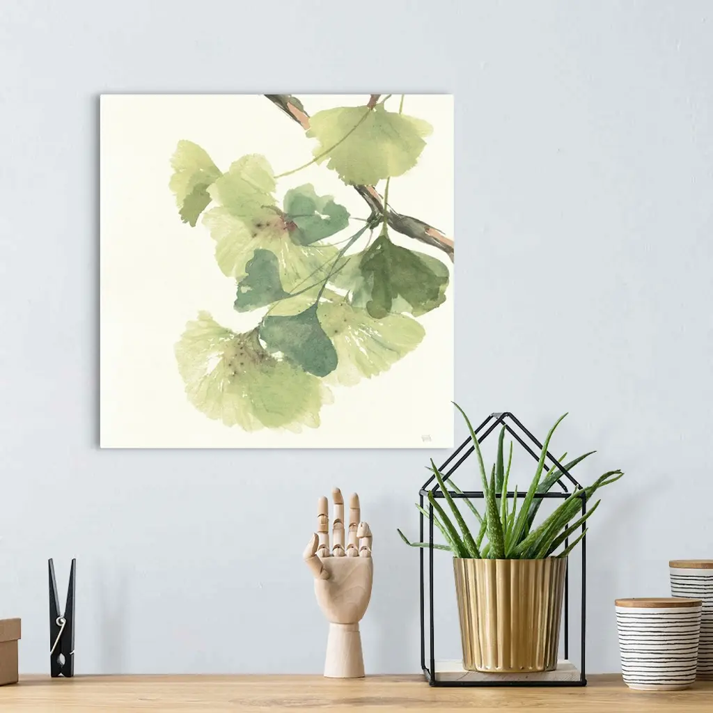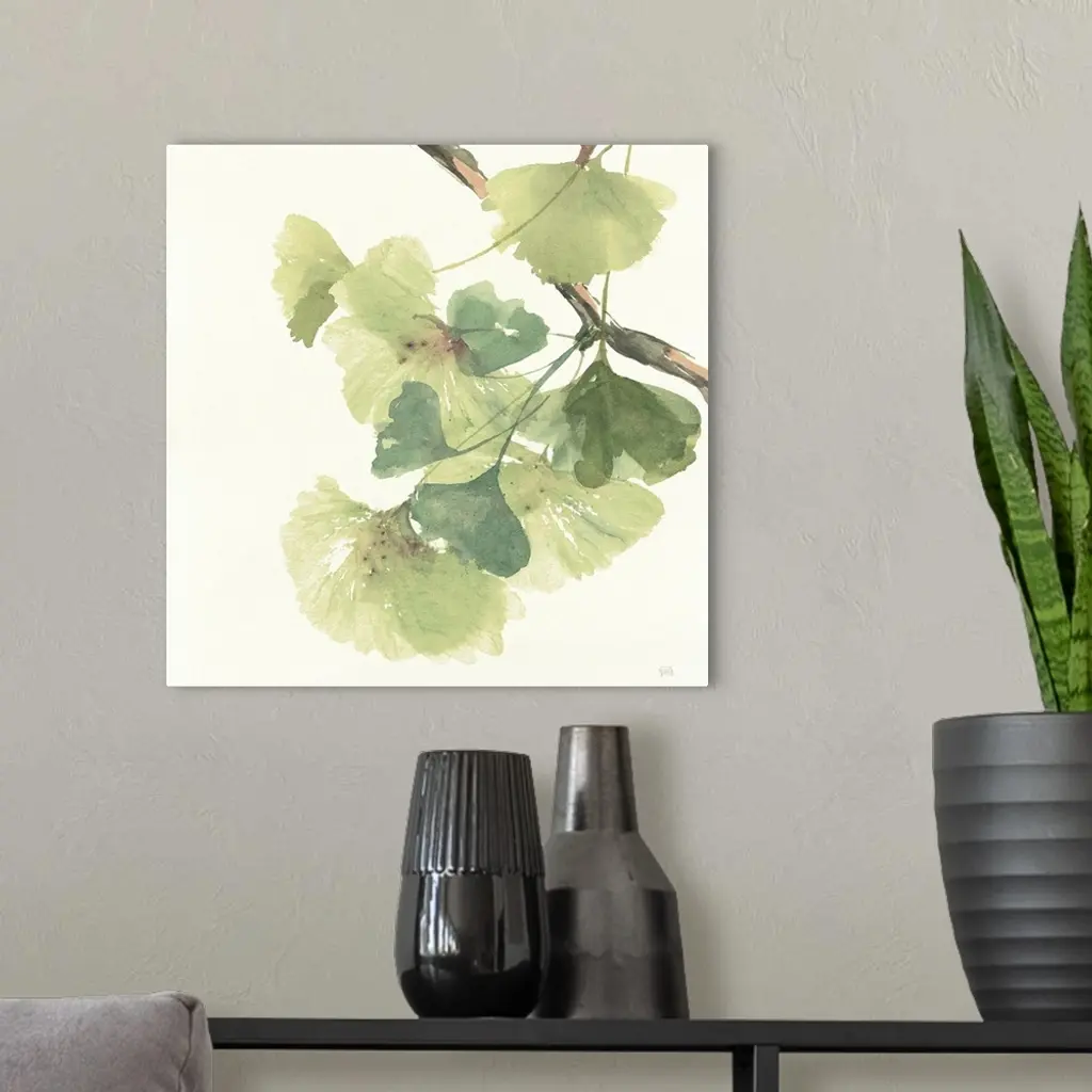 Square watercolor painting of a branch with ginkgo leaves in shades of green on a white background.