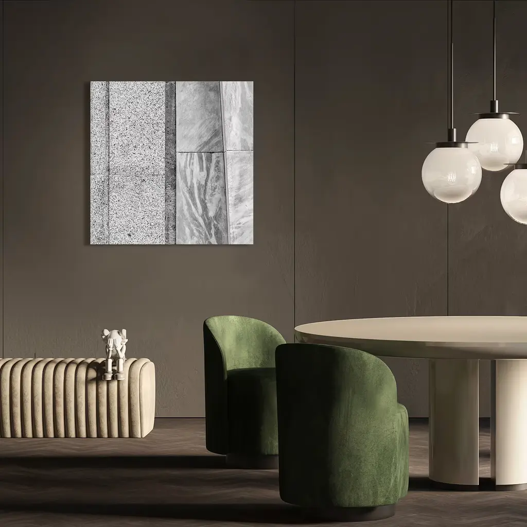 The elegant and sophisticated architecture of the historical Milan building Galleria Passerella 2, designed by Gio Ponti in collaboration with Antonio Fornaroli and the Soncini brothers in 1950, stands out from the extraordinary interplay of marble veining depicted in this close-up of the building's outside surface. Rendered in black and white, this photograph by Giulio Boem pays tribute to the renowned architect. This is a limited edition of n. 10. Delivered with a certificate of authenticity. Frame not included.