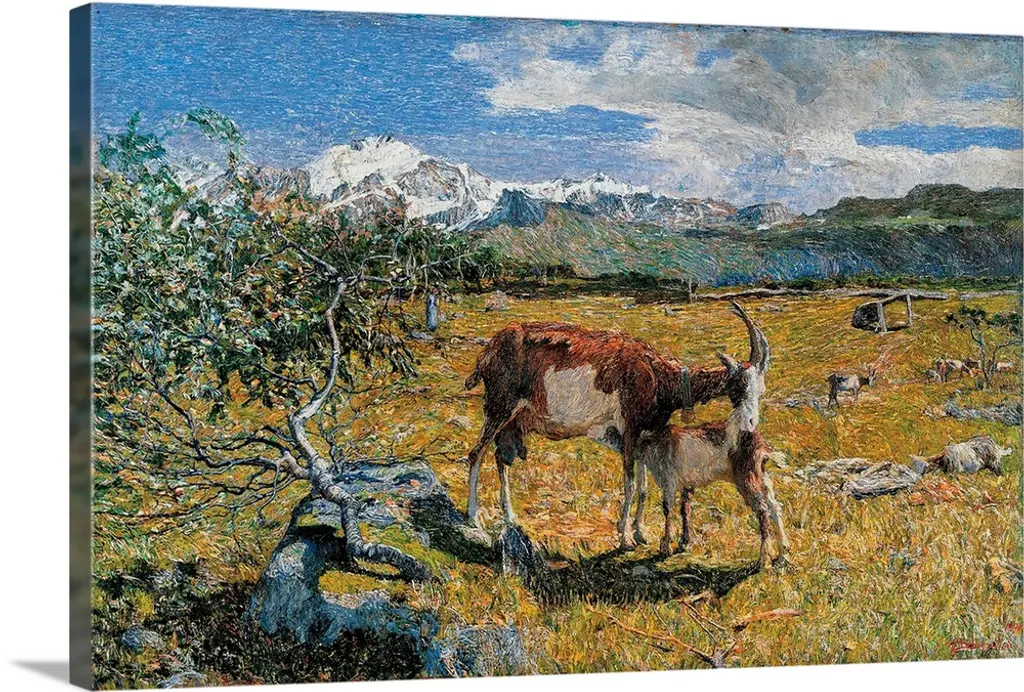18" x 27" Giovanni Segantini Cow at a Water Trough gallery wrapped premium canvas print reproduced to meet museum quality standards. Our museum quality canvas prints are produced using high-precision print technology for a more accurate reproduction printed on high quality canvas with fade-resistant, archival inks. Our progressive business model allows us to offer works of art to you at the best wholesale pricing, significantly less than art gallery prices, affordable to all. This artwork is gallery wrapped by one of our expert framers, wrapped with 1.5" deep heavy duty wooden stretcher bars, to hang frameless for a high-end designer look. Our gallery wrapped canvas print comes with hardware, ready to hang on your wall. We present a comprehensive collection of exceptional canvas art reproductions by Giovanni Segantini.