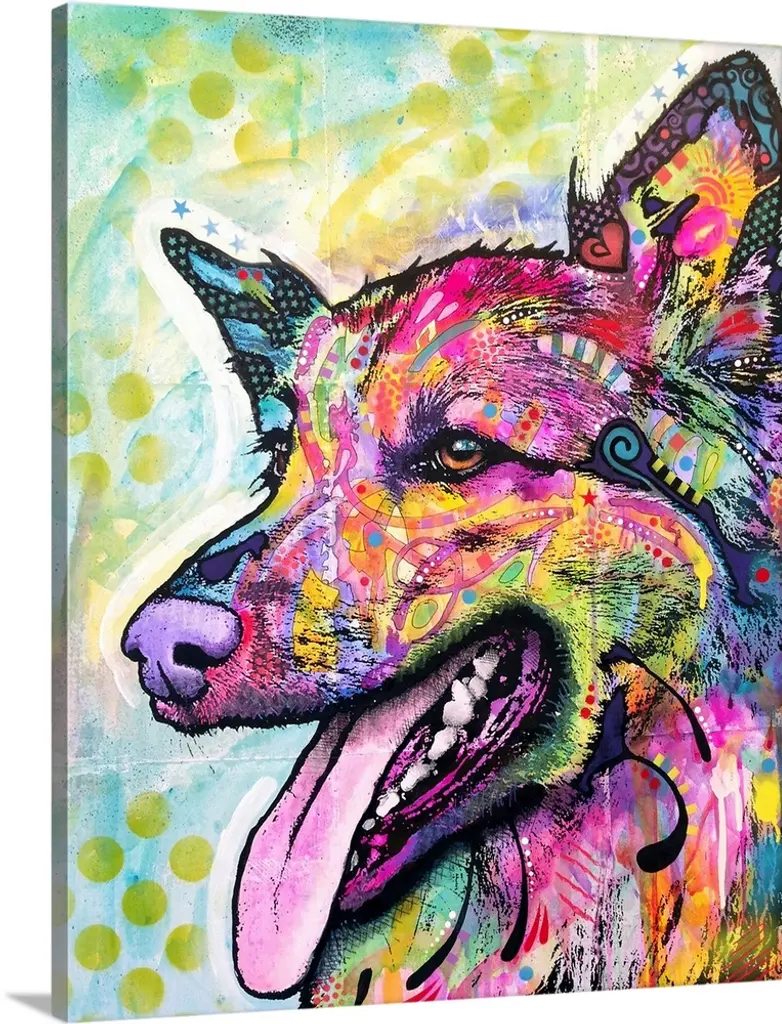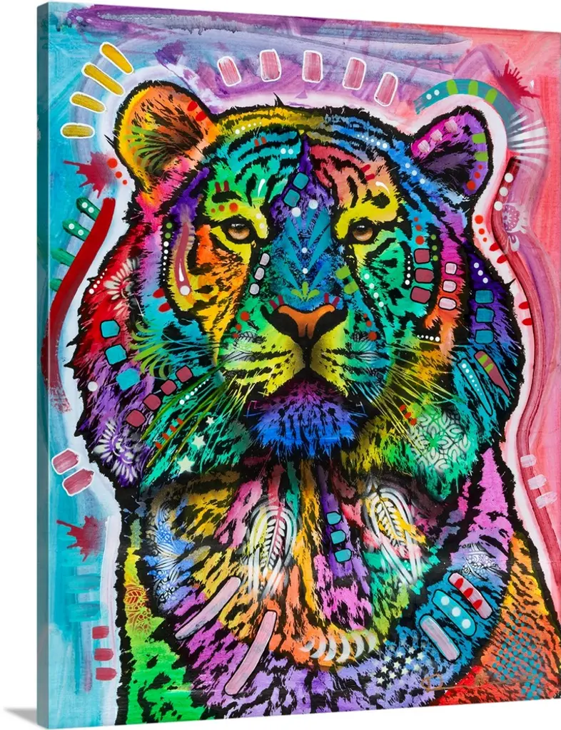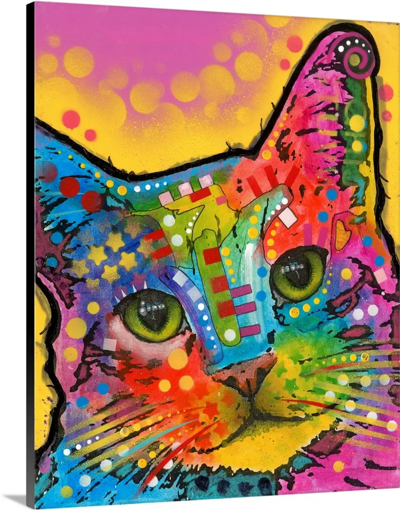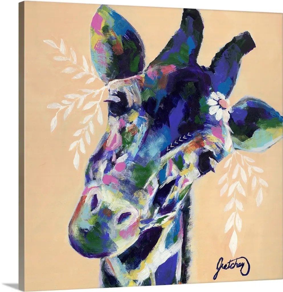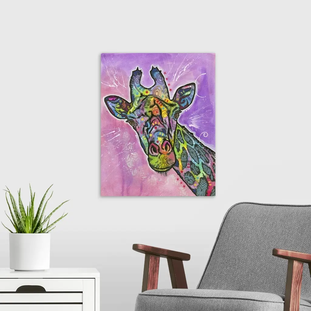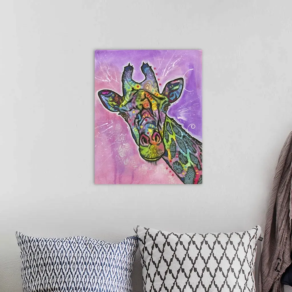 Colorful painting of a Giraffe with abstract markings on a pink and purple background with white paint splatter and designs.