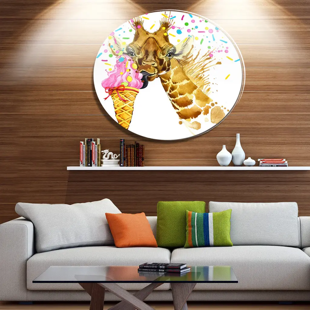 Bring Contemporary Abstraction to your home with this large Circle Metal wall art. This Giraffe Eating Ice Cream Watercolor Metal Artwork makes it the focal point of any room or office. - White Gloss Coating ensures colors are extra vibrant with light reflection.- Aluminum grade Sheet Metal with 1 inch mounting frame on the back giving the illusion that the artwork is floating on the wall..- Mounting Brackets are included along with instructions.- High Quality Digital images are created directly into a glossy aluminum panel producing a stunning and captivating print into the glossy finish of the metal.- Water, Fire and Scratch resistant HD Aluminum panels.- Looks better than any photo paper and guaranteed to last at least 20 years- Easy to clean with a microfiber cloth. Colors are far superior to regular Canvas Art. - Easy to Hang