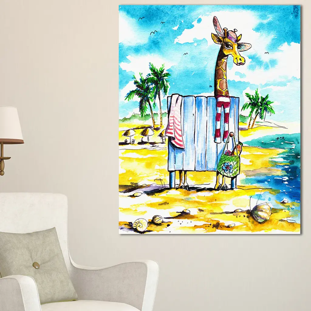 "Giraffe In Dressing Room On Beach" Cartoon Animal Print