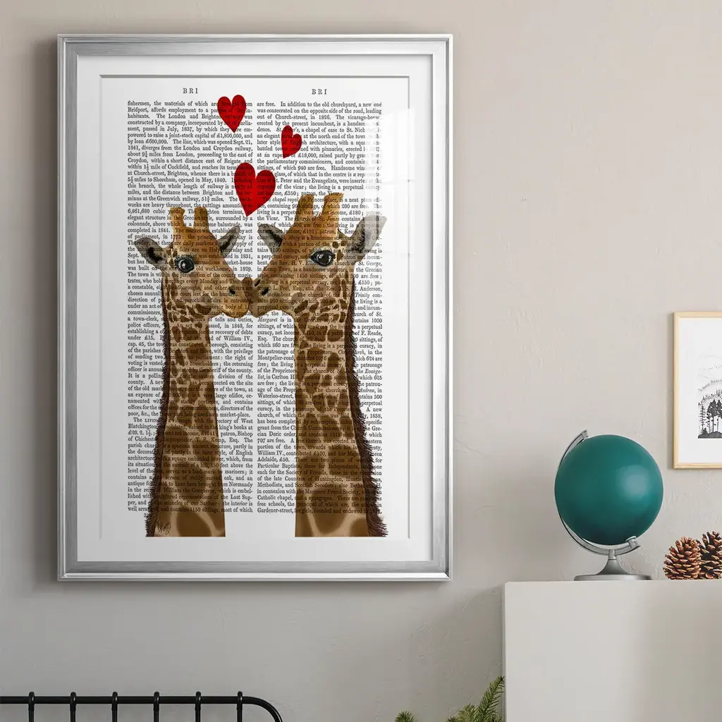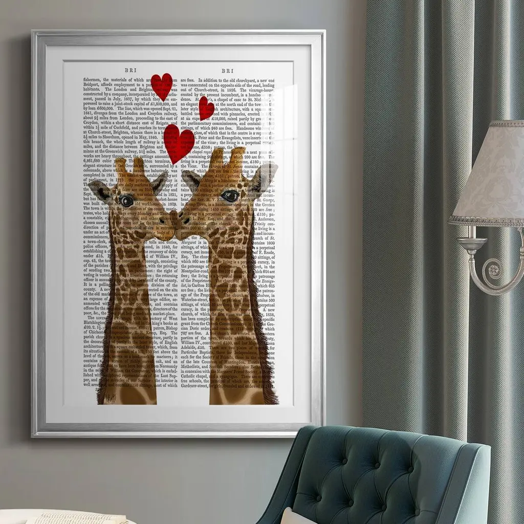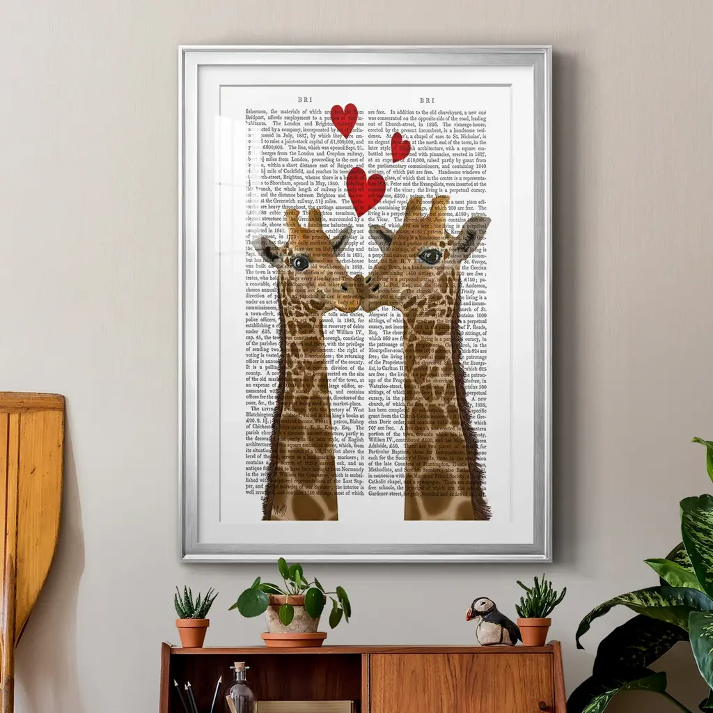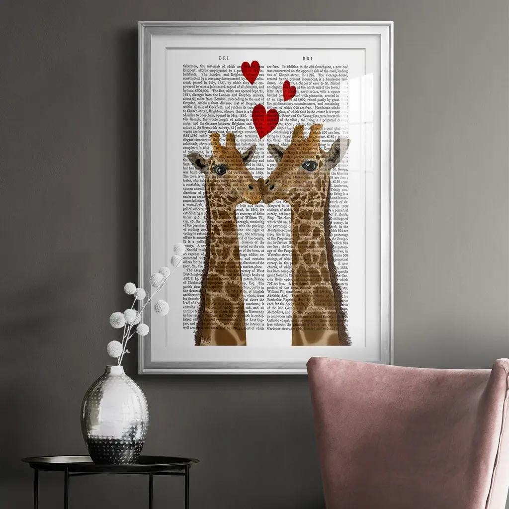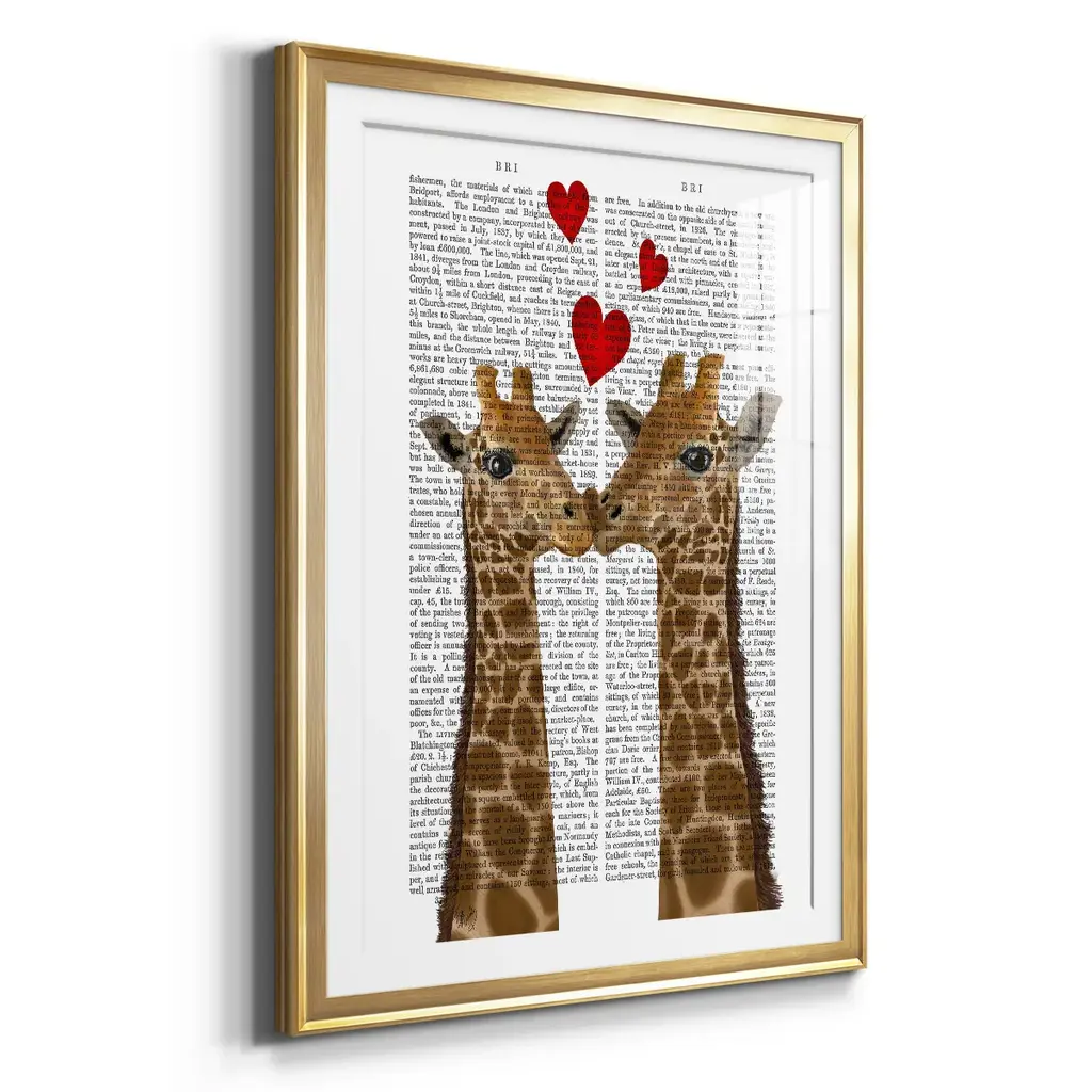 Giraffe Love Premium Framed Print - Ready to Hang A Premium Framed Print created to last. Framed in distressed wood and available in an array of sizes and colors Featuring a beveled a solid wood stretcher bar, each piece comes ready to hand 4 SIZES AVAILABLE 30.5''X42.5'' - Overall Size 26.5'X36.5'' - Overall Size 22.5''x30.5'' - Overall Size 18.5''x24.5'' - Overall Size Each piece is made to order. Each piece comes with hanging hardware. Made in the USA Ready to Hang Giclee Paper Print Acrylic Glass Beveled Matt Board
