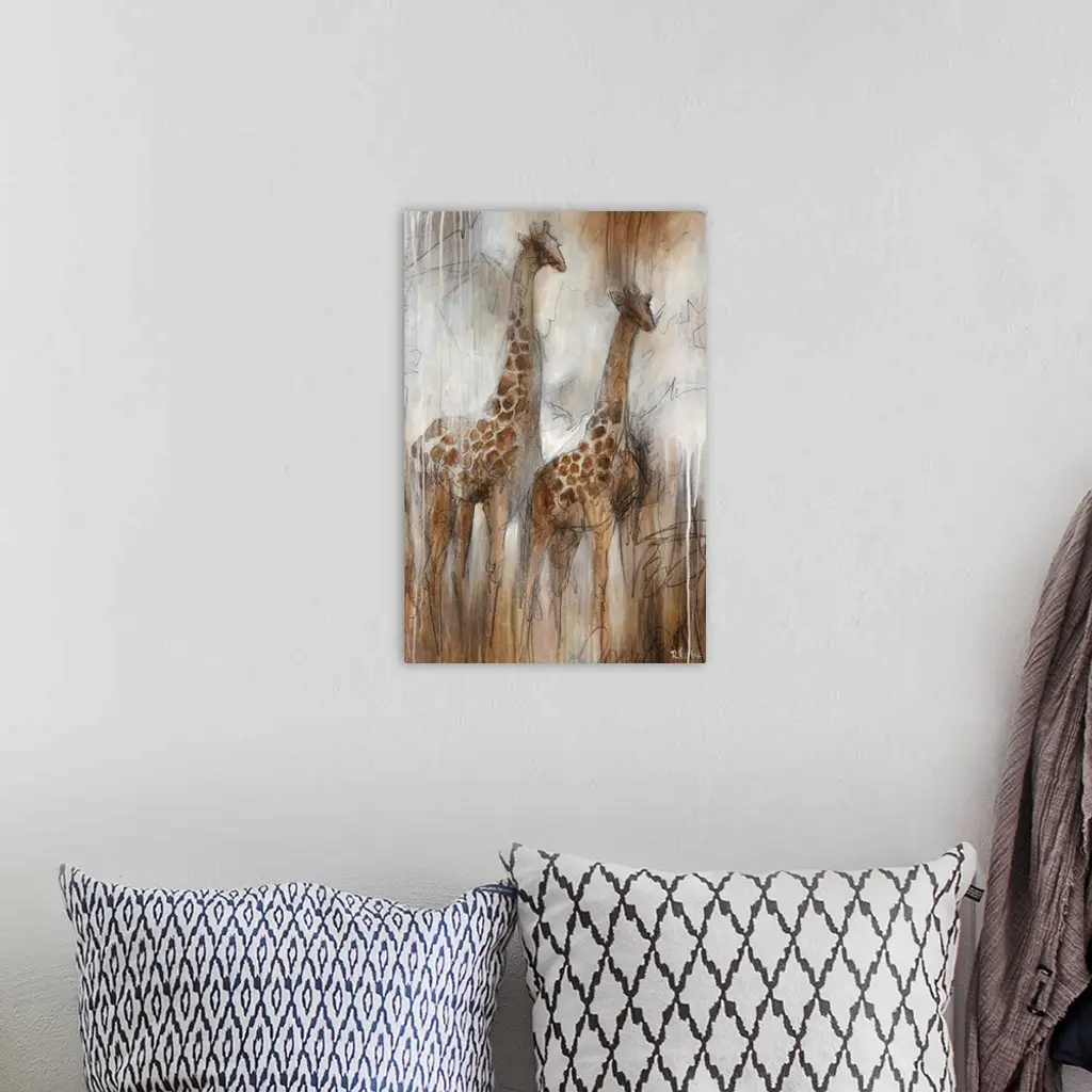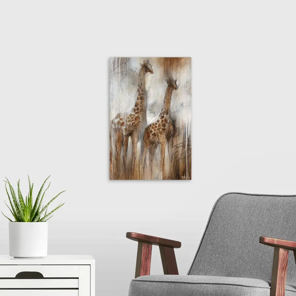 Illustrative painting of two giraffes done in varying shades of grayish-brown.