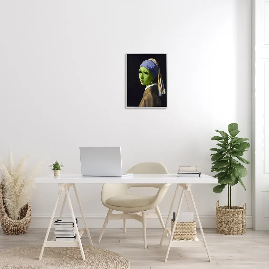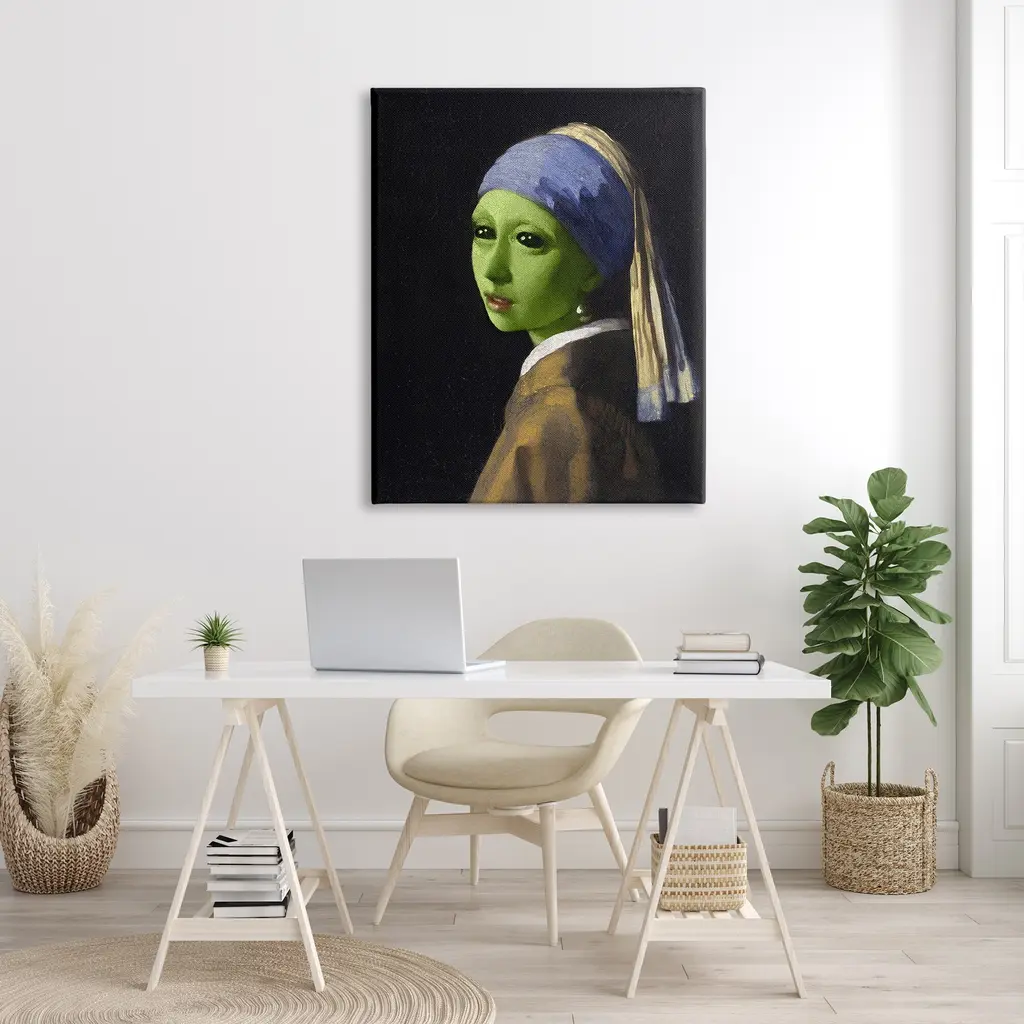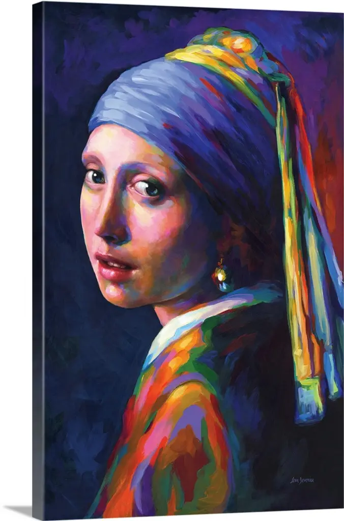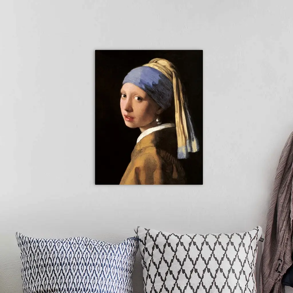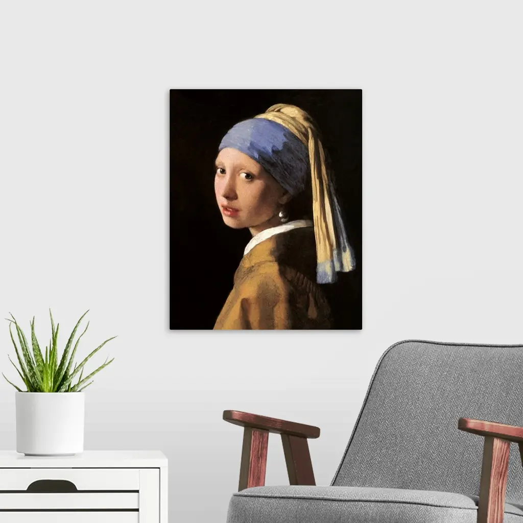 Classic artwork of a girl that has her head slightly turned to the side so you can only see the left side of her face and the pearl earring.