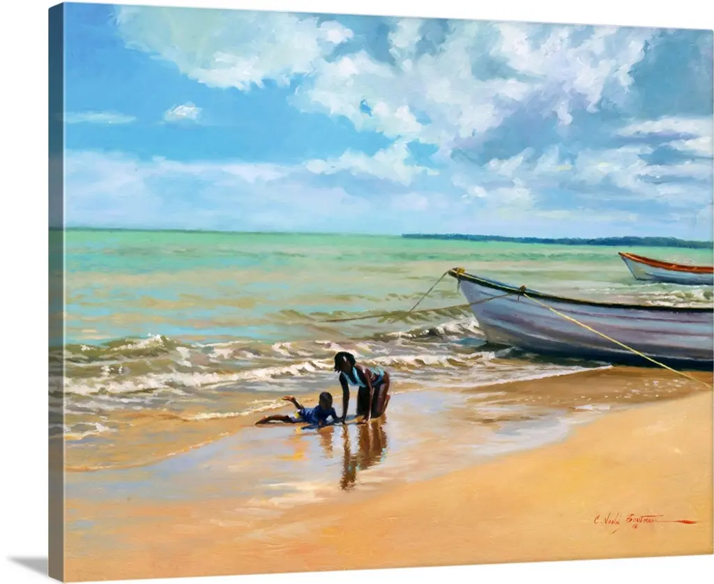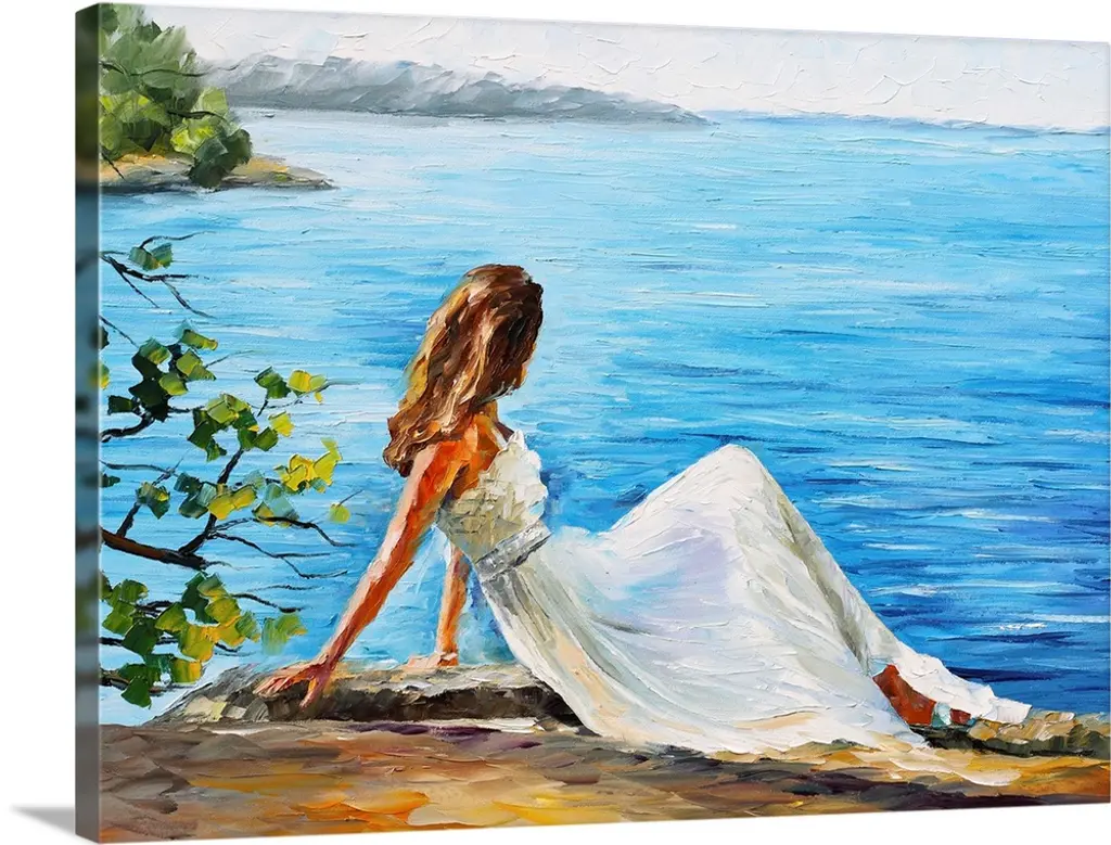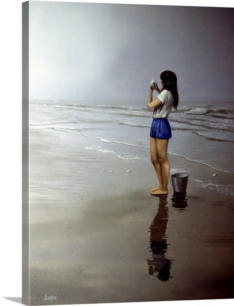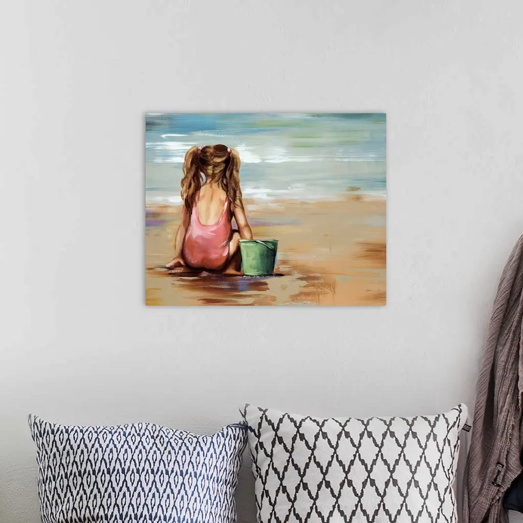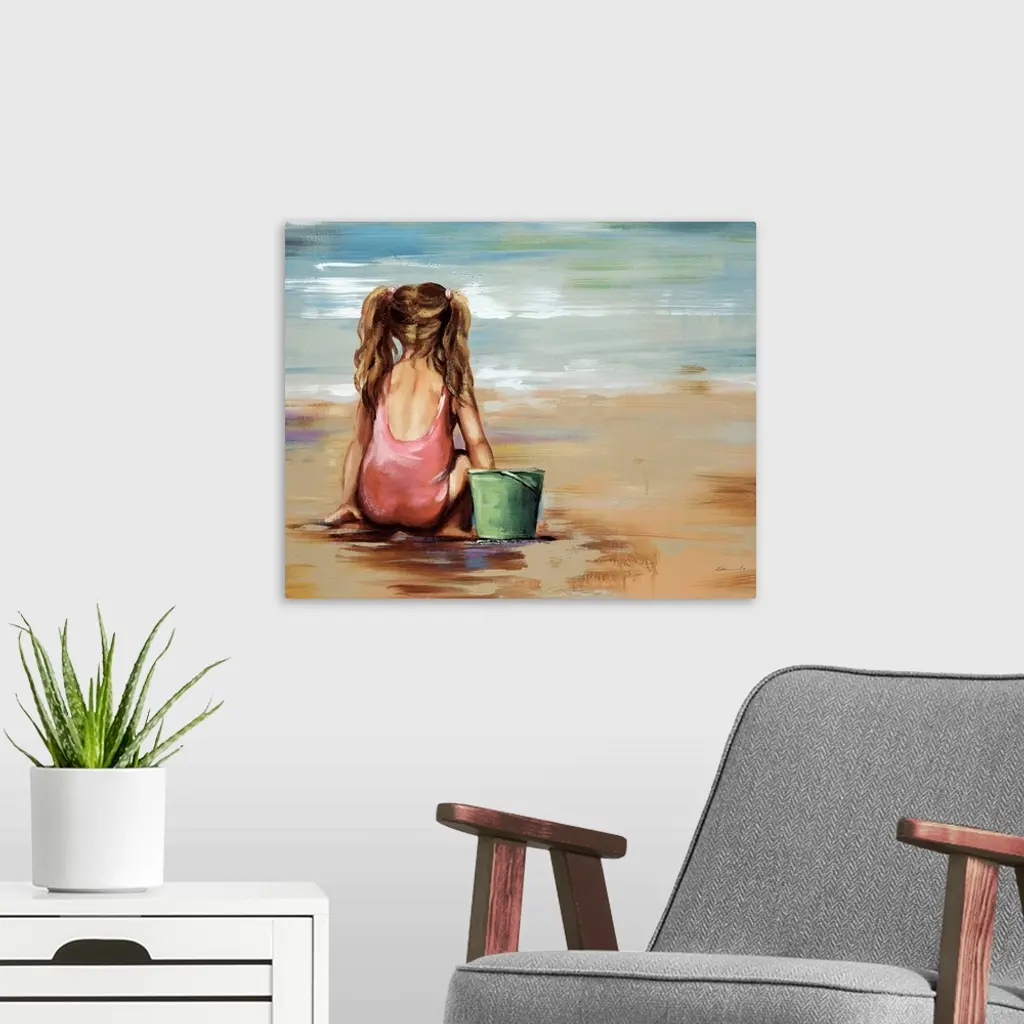 Large, landscape figurative painting of a girl sitting on the beach, facing the water, in her swimsuit with pigtails in her hair, and a green bucket sitting next to her.