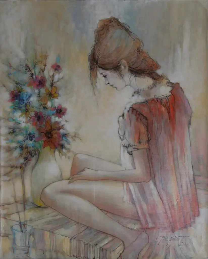 Girl With Flower Bouquet, Floral Large Disc Metal Wall Art, 11"