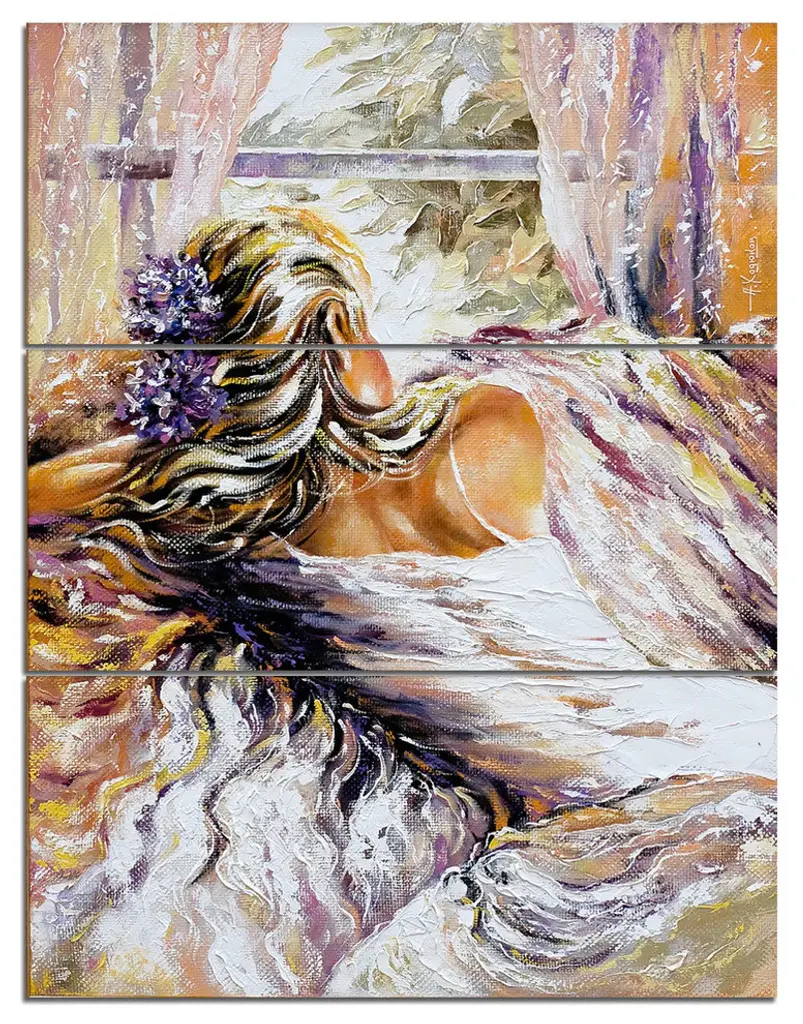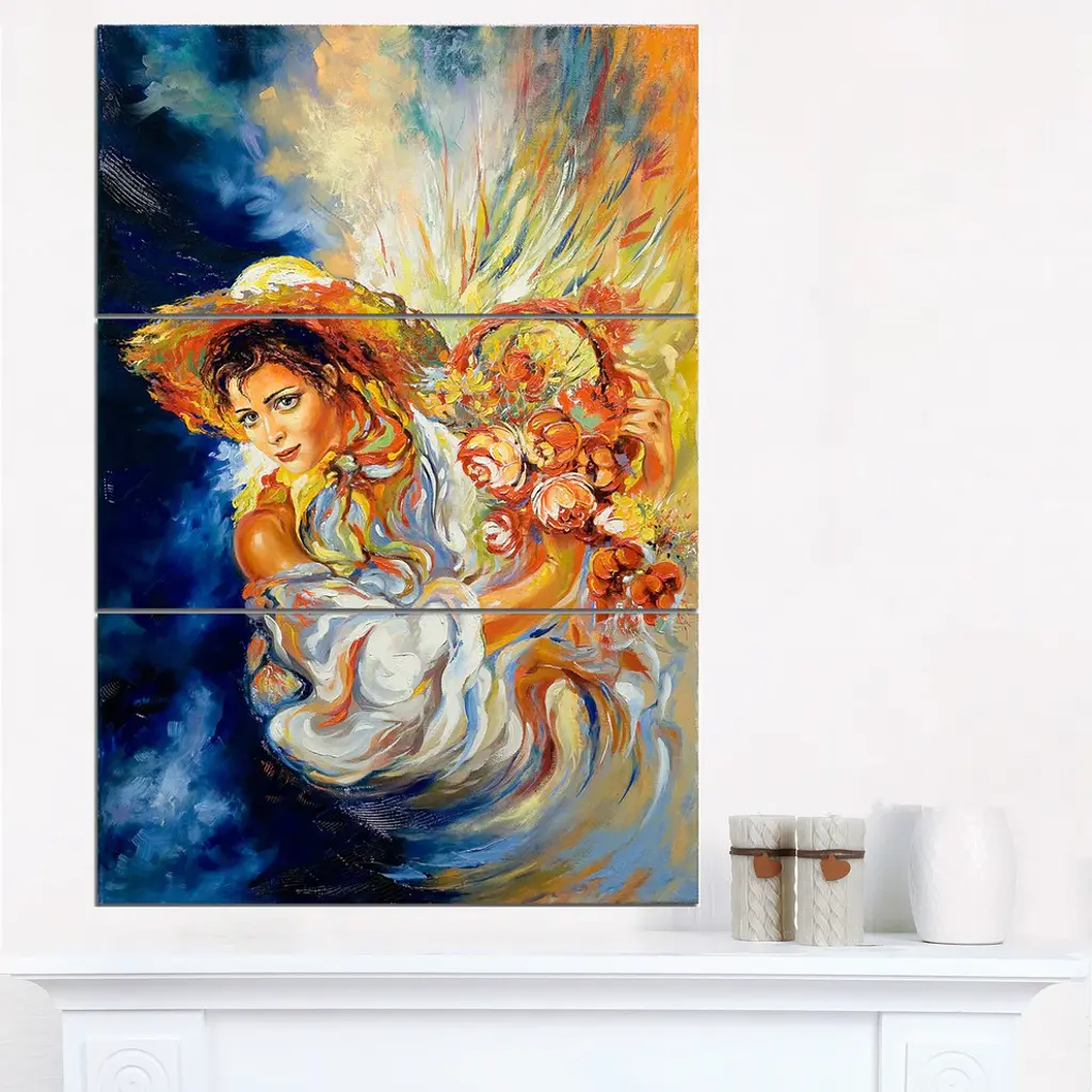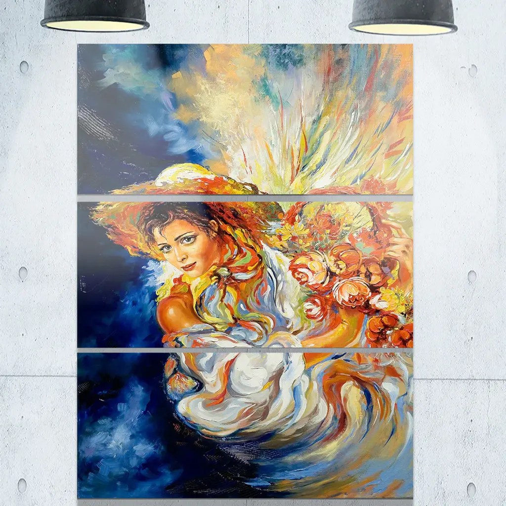 "Girl With Flowers" Glossy Metal Wall Art, 3 Panels, 28"x36"