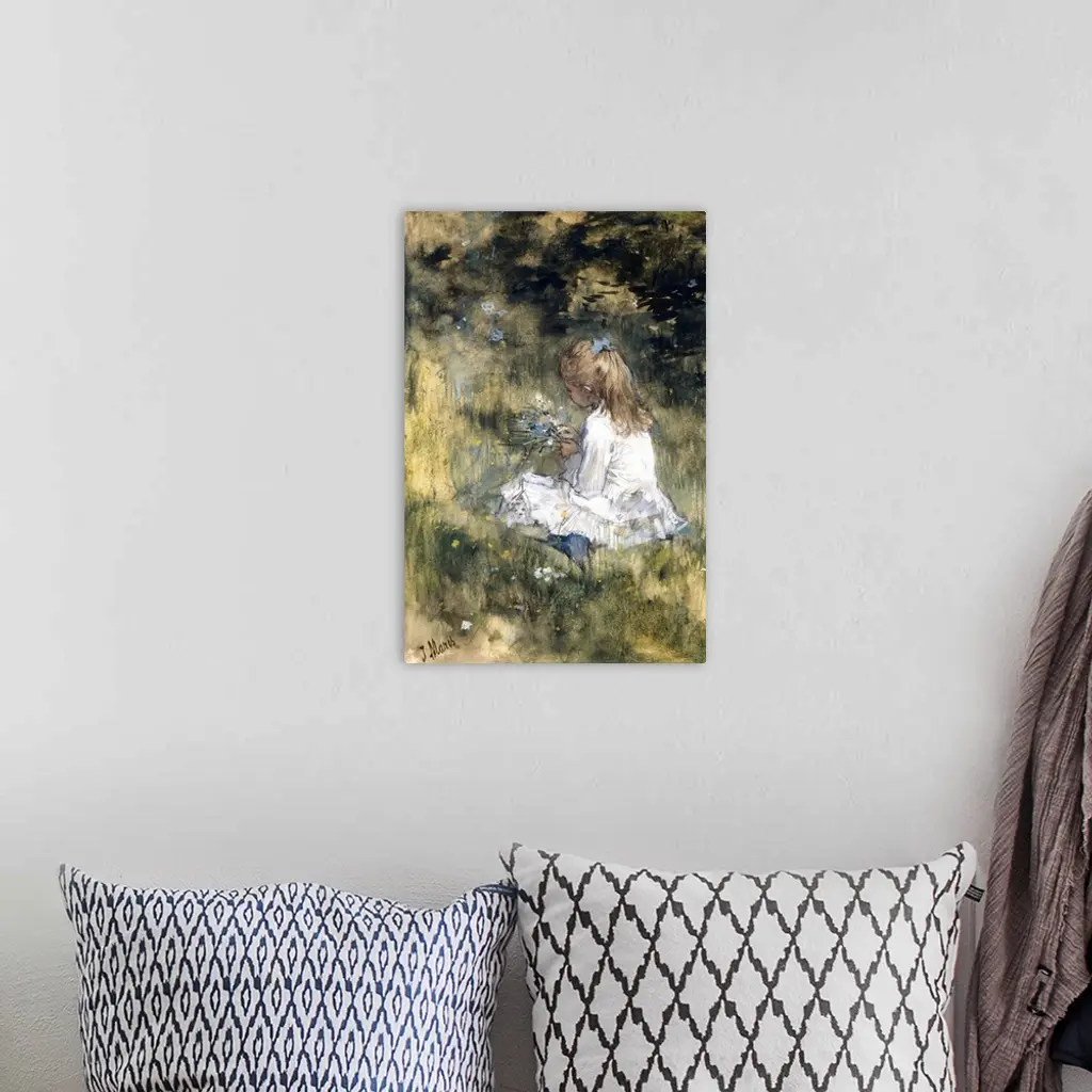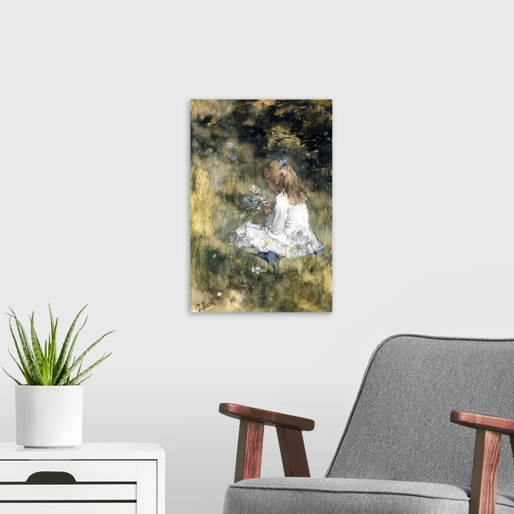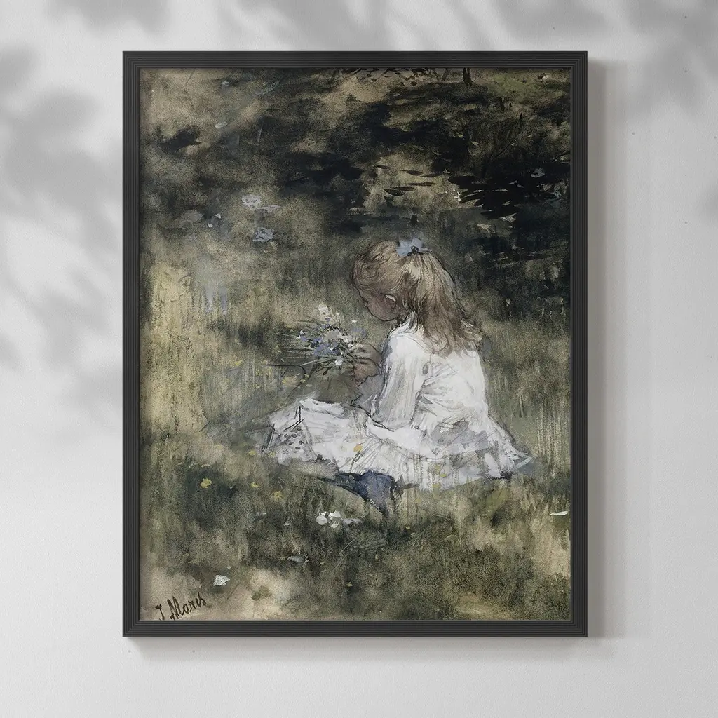 Girl with Flowers on the Grass, by Jacob Maris, 1878, Dutch watercolor painting, drawing with chalk. A girl in a white dress seated on the ground, holding a bouquet of wild flowers. The girl is probably the artist's daughter.