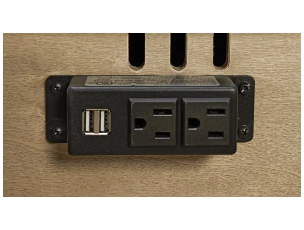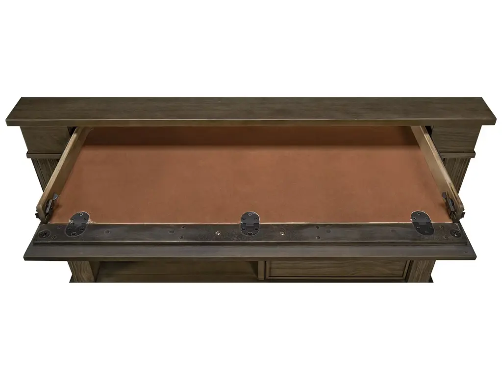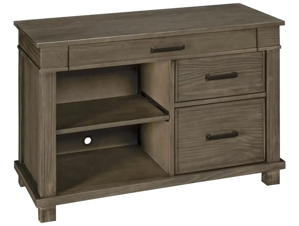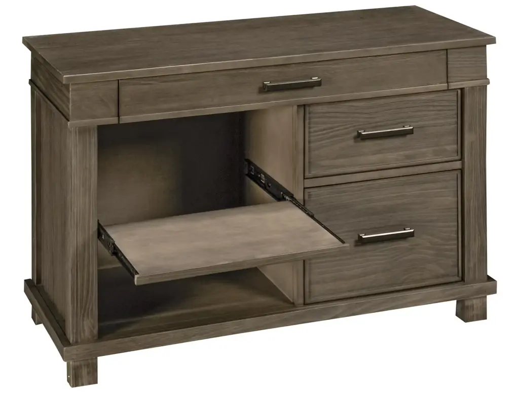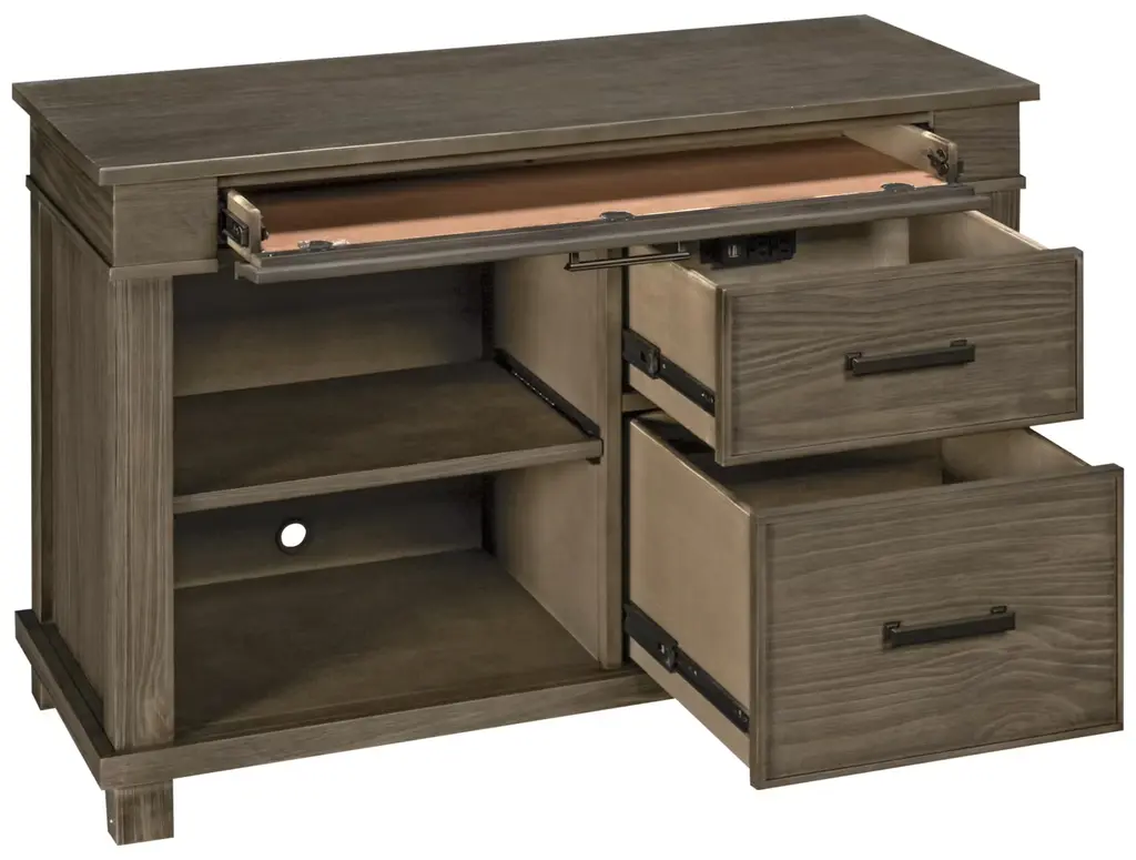 The A America Glacier Point Printing Station is an ideal furniture piece for the home office multitasker. This multifunctional printing station features two side storage drawers, one center drop-front drawer for your keyboard or laptop computer, and a pull-out shelf on the left to accommodate your printer. There is also a wire cutout for organizing electronics cords, plus a power strip with USB charging ports. Made of solid pine, this printing station boasts a greystone finish with oxidized iron hardware.