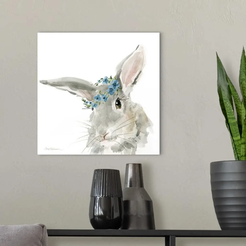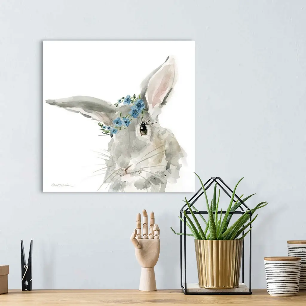 Cute watercolor painting of a gray rabbit wearing a blue flower crown on a solid white, square background.