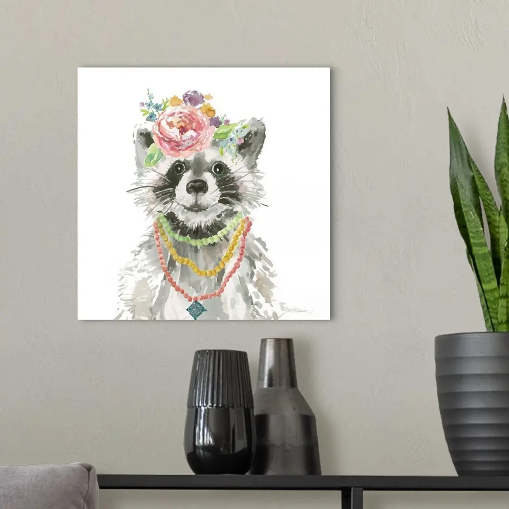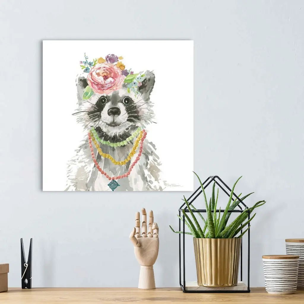 Cute watercolor painting of a young raccoon wearing colorful necklaces and flowers on its head, on a solid white square background.