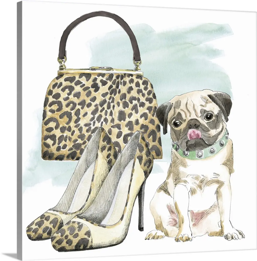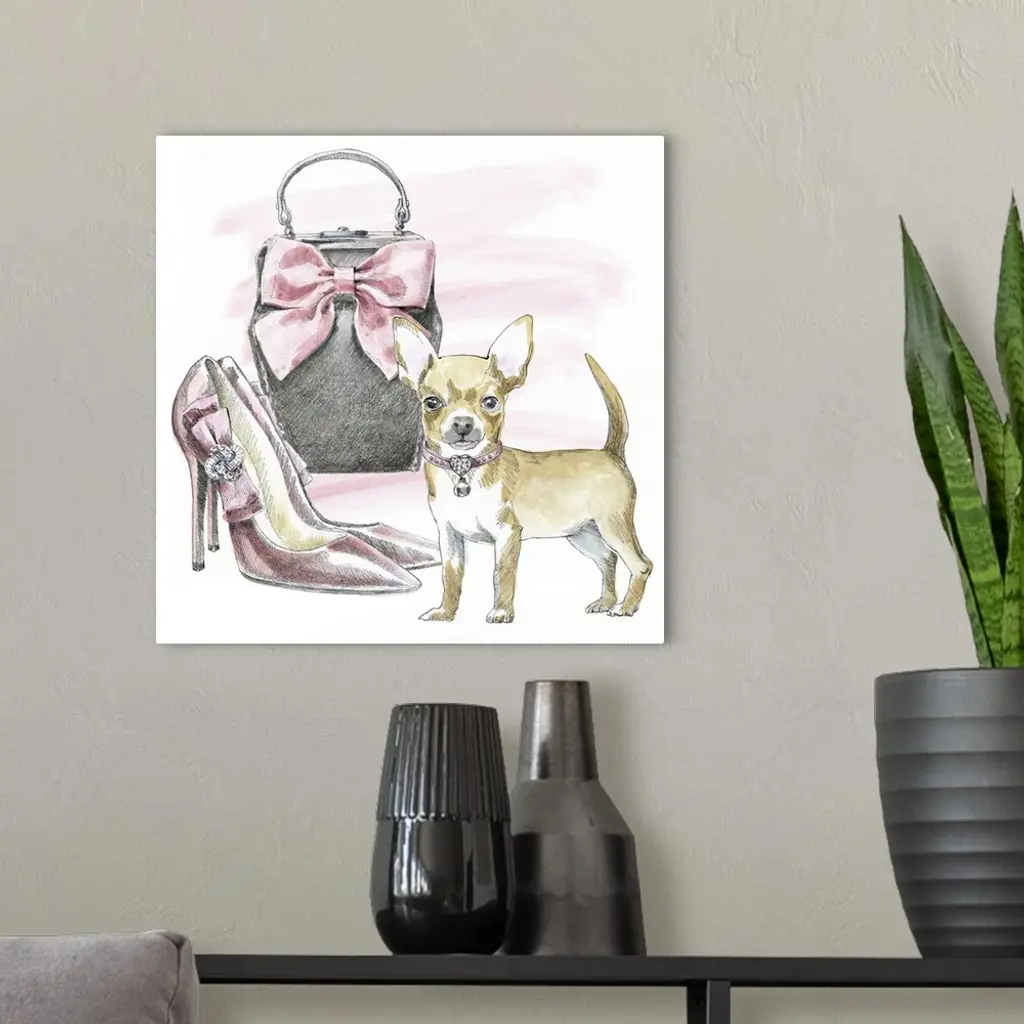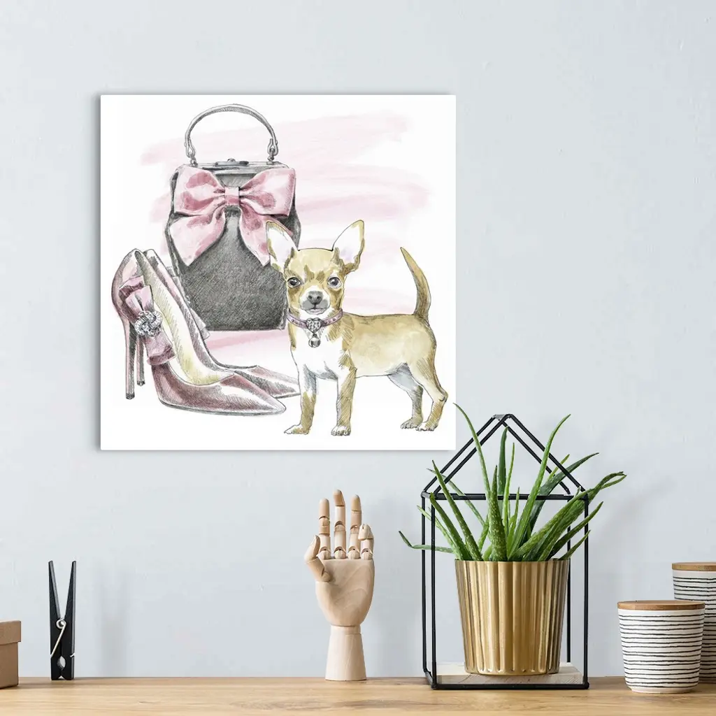 Square watercolor painting of a Chihuahua with a pair of stylish pink high feels and a purse.