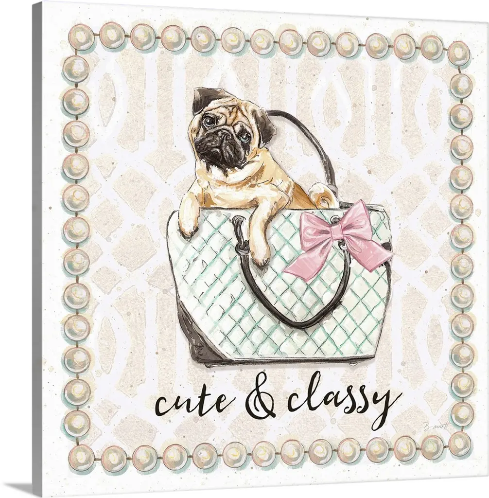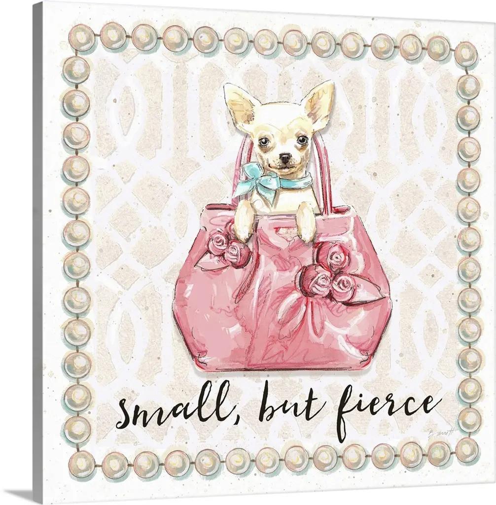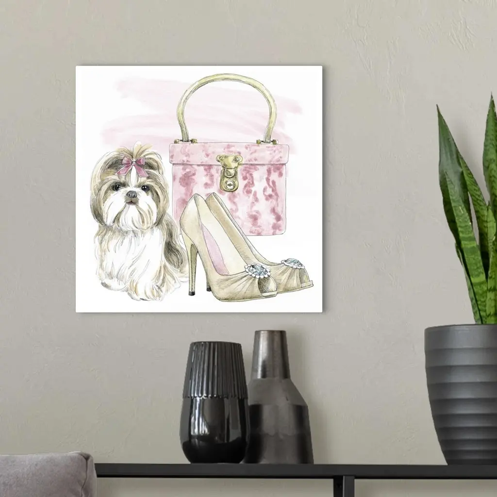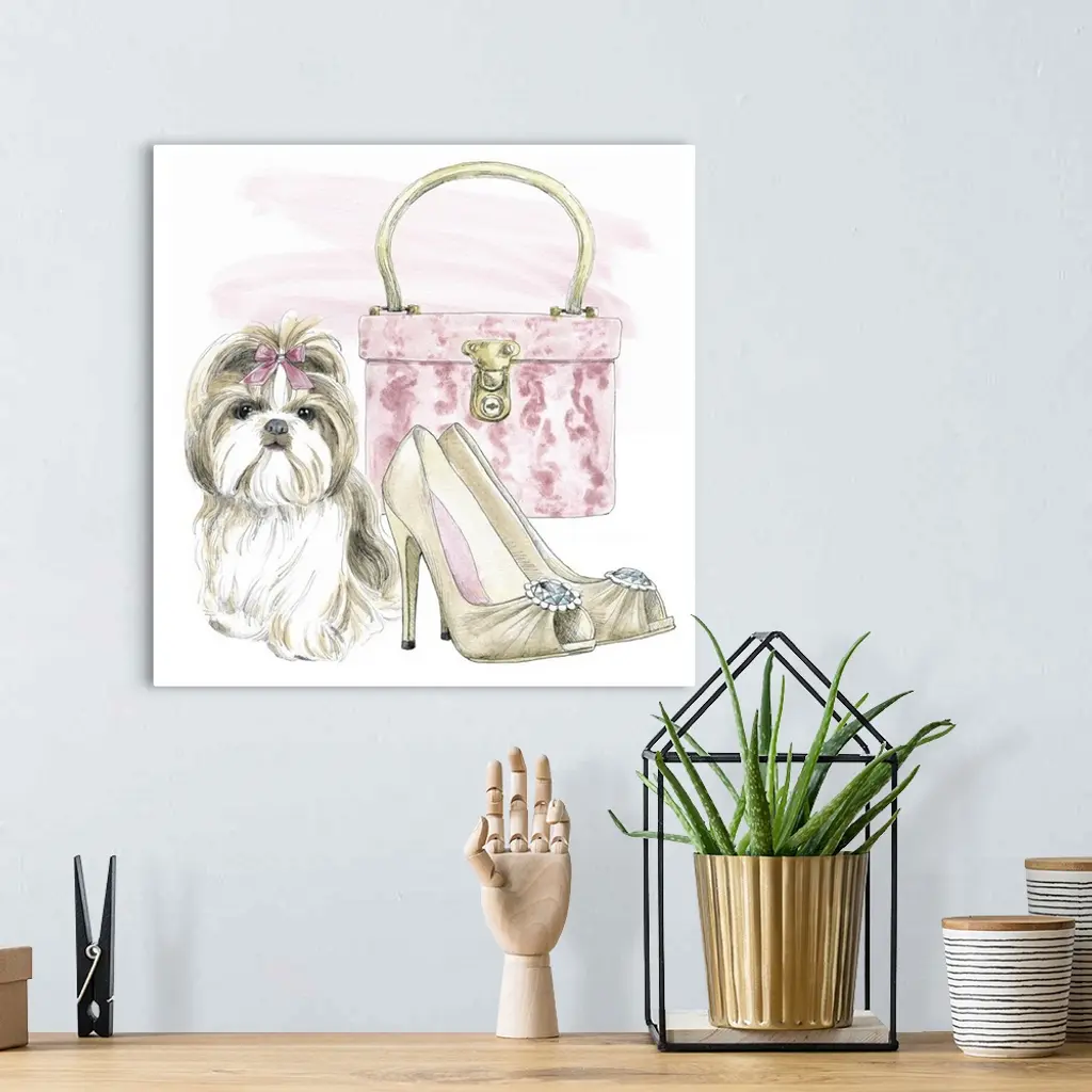 Square watercolor painting of a Shih Tzu with a pair of tan high heels and a pink purse.