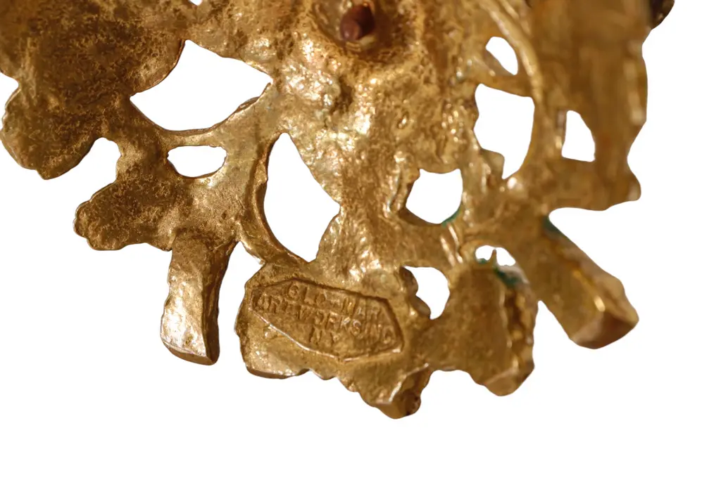 A pair of brass Glo-Mar Artworks of NY candlesticks in the form of twisting grape vines. The capital, stem and base are separate pieces cast in an intricate pierced design with vine leaves and grape bunches throughout. The candlesticks are stamped with the maker's mark on the base. Dimensions per candlestick.