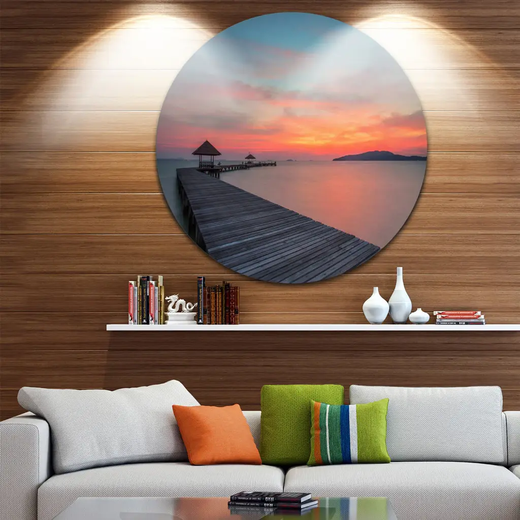 Gloomy Seashore With Long Wood Pier, Sea Pier Round Metal Wall Art, 23"