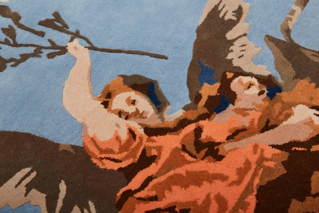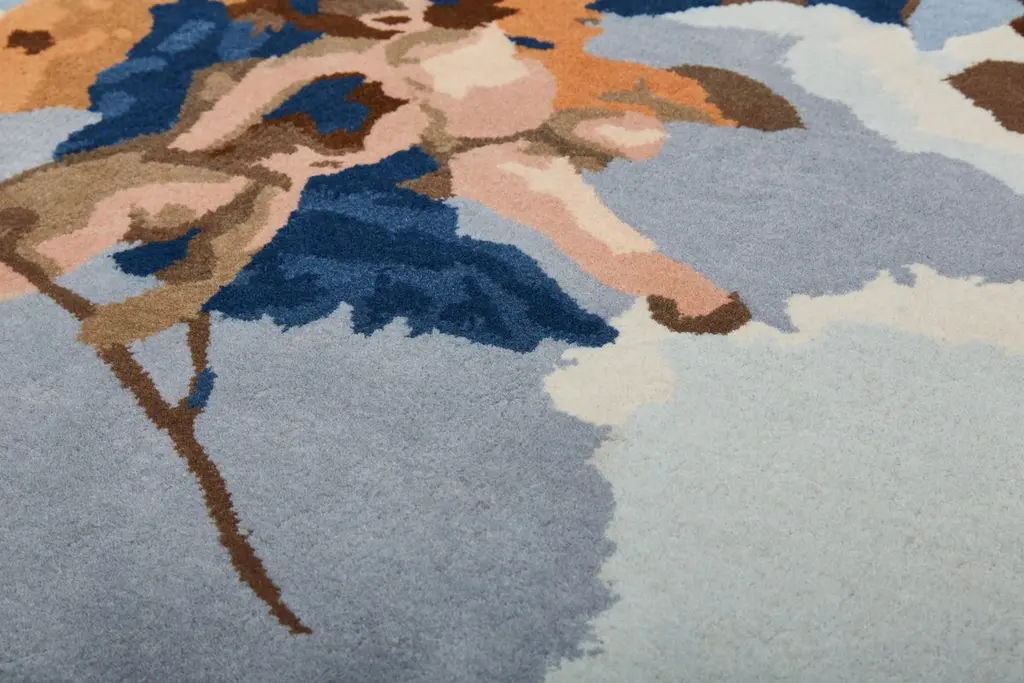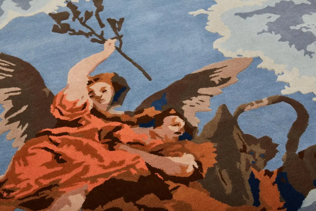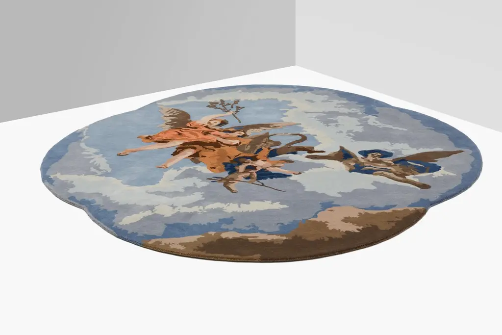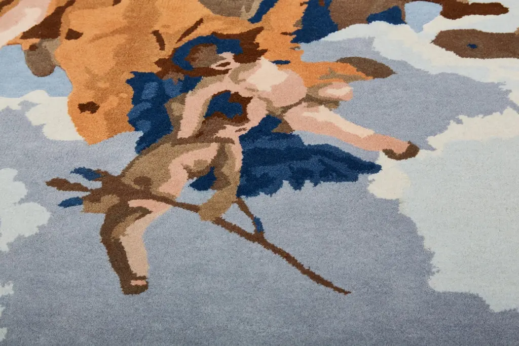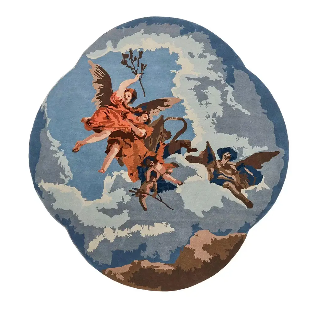This captivating rug designed by Alessandra Baldereschi is an artistic homage to 18th century Venetian painter Giambattista Tiepolo, reinterpreting his Gloria d'Angeli with a modern twist. The undulating profile reflects the painting's original frame while the floating angelic figures and colors take on a modern style. Entirely hand-tufted in India using wool, this superb rug has a pile of 10mm-height.