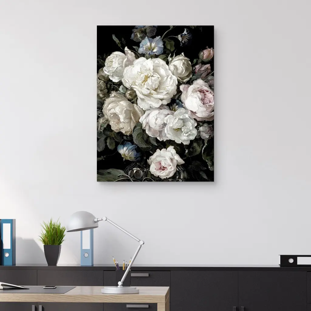Deep shadows cast a bouquet of plump peonies in striking relief in Angela McQueen's Glorious Bouquet III. McQueen's attention to detail and virtuosic ability bring this fierce botanical piece to life before your very eyes.