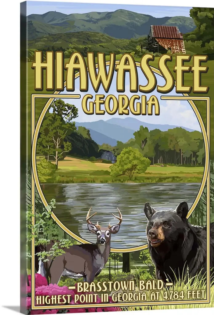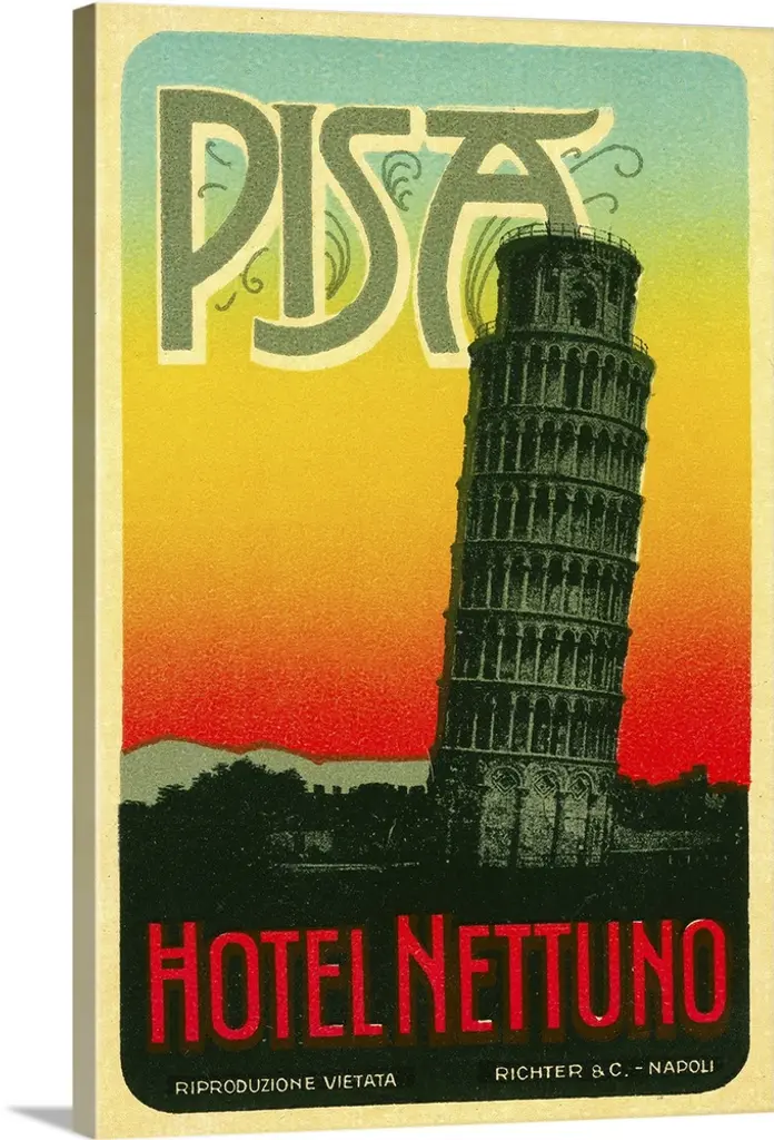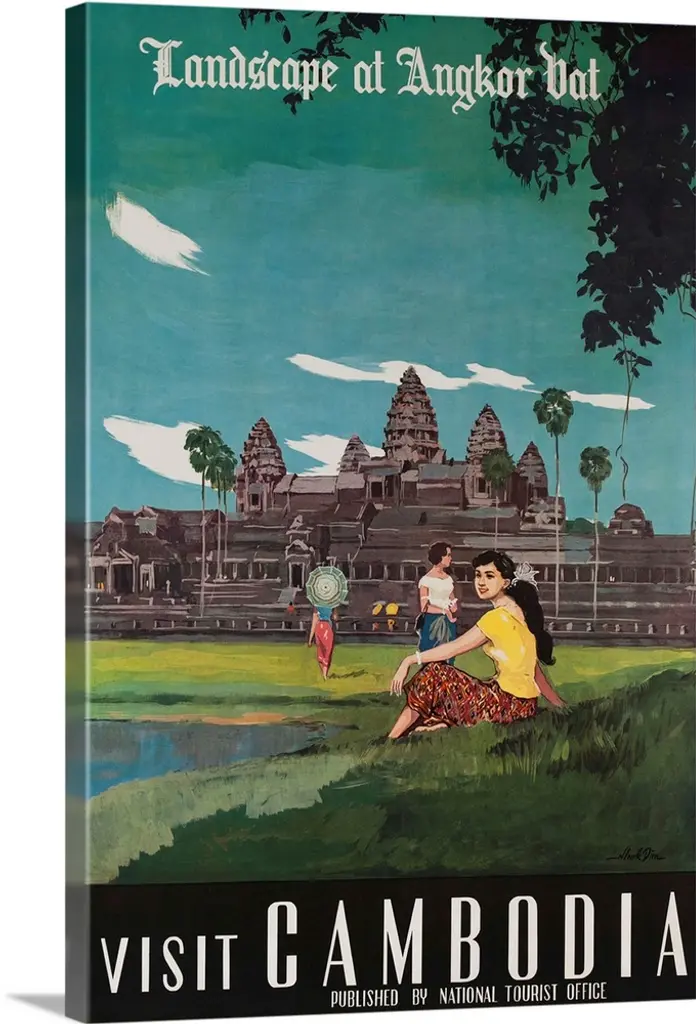 Advertising poster print of two hikers at cliff's edge overlooking ocean.