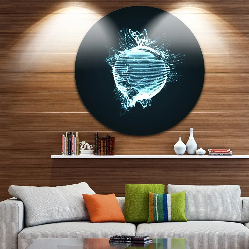 Bring Contemporary Abstraction to your home with this large Circle Metal wall art. This Glowing Blue 3D Sphere Metal Artwork makes it the focal point of any room or office. - White Gloss Coating ensures colors are extra vibrant with light reflection.- Aluminum grade Sheet Metal with 1 inch mounting frame on the back giving the illusion that the artwork is floating on the wall..- Mounting Brackets are included along with instructions.- High Quality Digital images are created directly into a glossy aluminum panel producing a stunning and captivating print into the glossy finish of the metal.- Water, Fire and Scratch resistant HD Aluminum panels.- Looks better than any photo paper and guaranteed to last at least 20 years- Easy to clean with a microfiber cloth. Colors are far superior to regular Canvas Art. - Easy to Hang