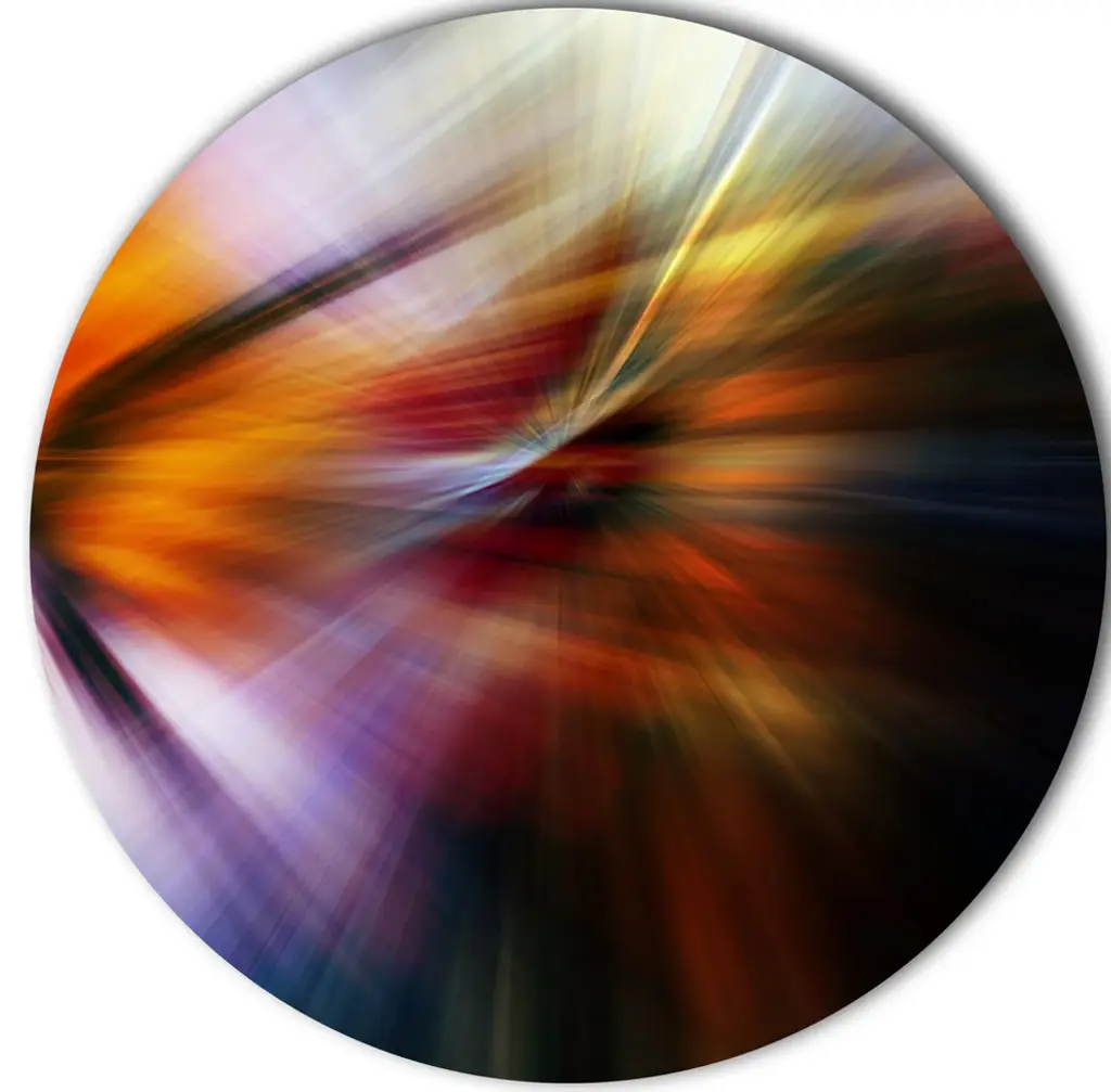 Bring Contemporary Abstraction to your home with this large Circle Metal wall art. This Glowing Brown Focus Light Metal Artwork makes it the focal point of any room or office. - White Gloss Coating ensures colors are extra vibrant with light reflection.- Aluminum grade Sheet Metal with 1 inch mounting frame on the back giving the illusion that the artwork is floating on the wall..- Mounting Brackets are included along with instructions.- High Quality Digital images are created directly into a glossy aluminum panel producing a stunning and captivating print into the glossy finish of the metal.- Water, Fire and Scratch resistant HD Aluminum panels.- Looks better than any photo paper and guaranteed to last at least 20 years- Easy to clean with a microfiber cloth. Colors are far superior to regular Canvas Art. - Easy to Hang