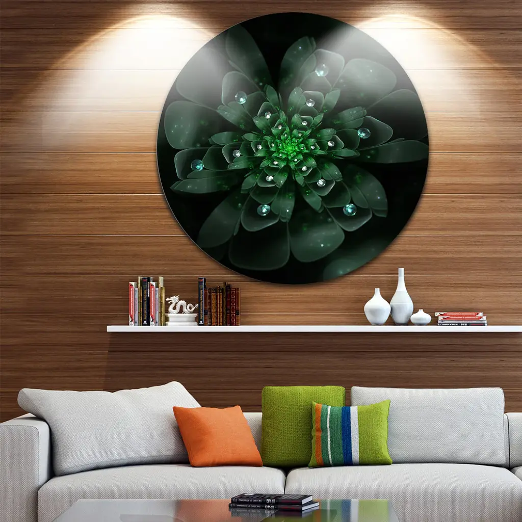 Bring Contemporary Abstraction to your home with this large Circle Metal wall art. This Glowing Crystal Green Fractal Flower Metal Artwork makes it the focal point of any room or office. - White Gloss Coating ensures colors are extra vibrant with light reflection.- Aluminum grade Sheet Metal with 1 inch mounting frame on the back giving the illusion that the artwork is floating on the wall..- Mounting Brackets are included along with instructions.- High Quality Digital images are created directly into a glossy aluminum panel producing a stunning and captivating print into the glossy finish of the metal.- Water, Fire and Scratch resistant HD Aluminum panels.- Looks better than any photo paper and guaranteed to last at least 20 years- Easy to clean with a microfiber cloth. Colors are far superior to regular Canvas Art. - Easy to Hang