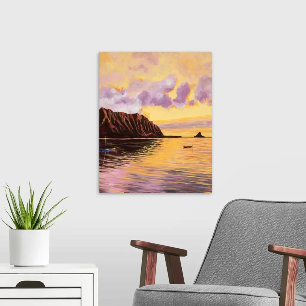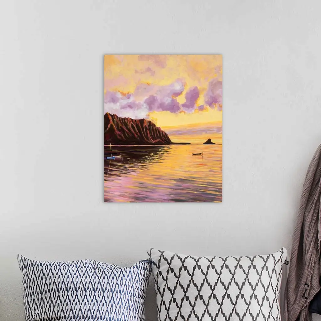 Glowing Kualoa (Diptych 2 Of 2), Hawaii, Oahu, Kualoa Point Right Side And Reflections At Sunset (Acrylic Painting) - Diptych Series.