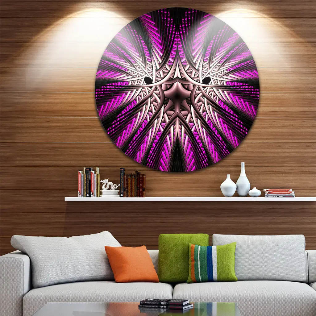Bring Contemporary Abstraction to your home with this large Circle Metal wall art. This Glowing Purple White Fractal Flower Metal Artwork makes it the focal point of any room or office. - White Gloss Coating ensures colors are extra vibrant with light reflection.- Aluminum grade Sheet Metal with 1 inch mounting frame on the back giving the illusion that the artwork is floating on the wall..- Mounting Brackets are included along with instructions.- High Quality Digital images are created directly into a glossy aluminum panel producing a stunning and captivating print into the glossy finish of the metal.- Water, Fire and Scratch resistant HD Aluminum panels.- Looks better than any photo paper and guaranteed to last at least 20 years- Easy to clean with a microfiber cloth. Colors are far superior to regular Canvas Art. - Easy to Hang
