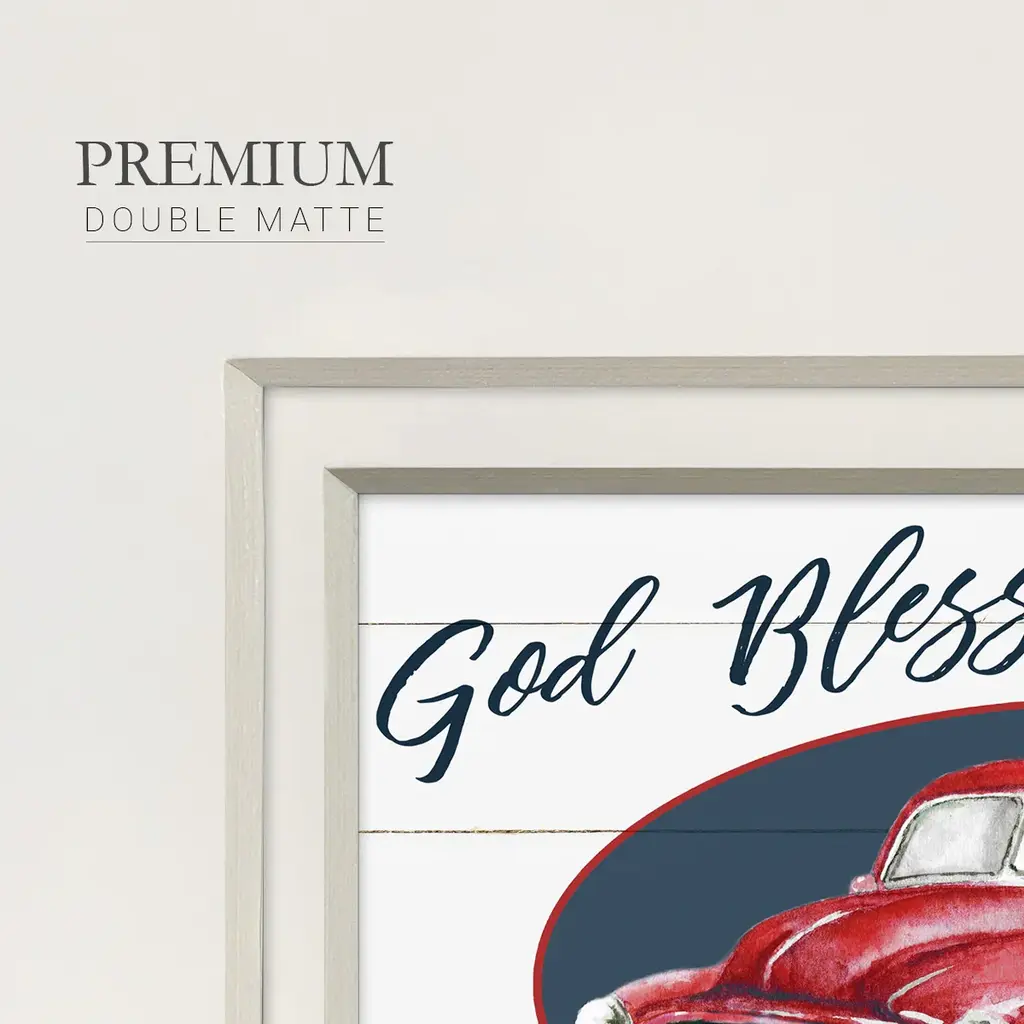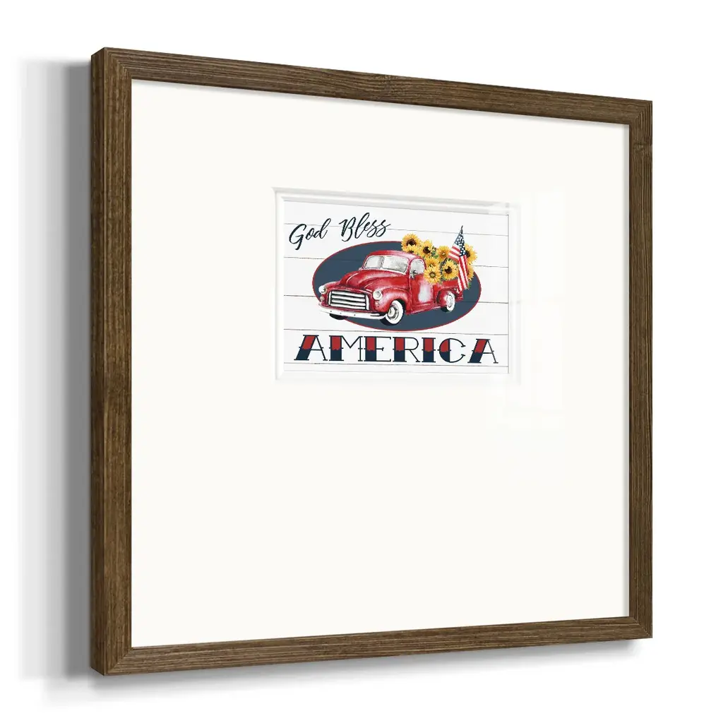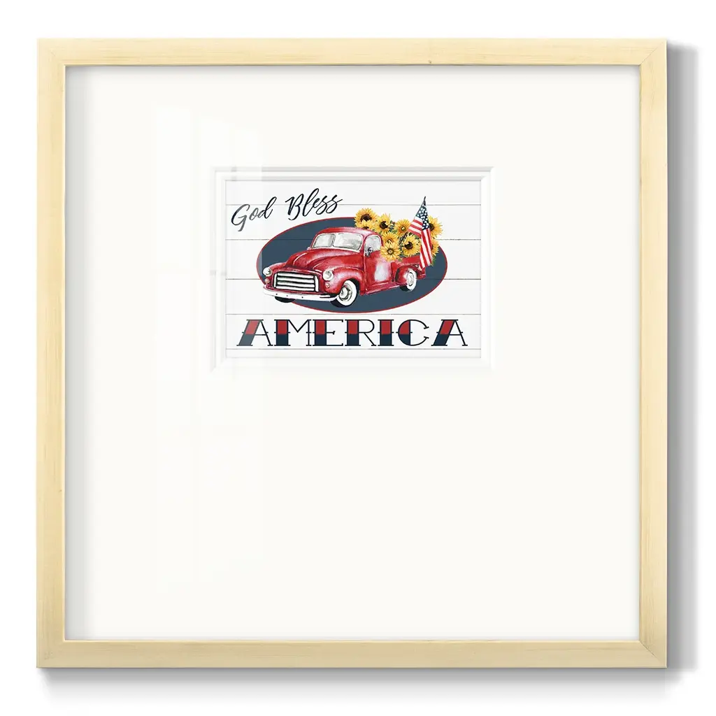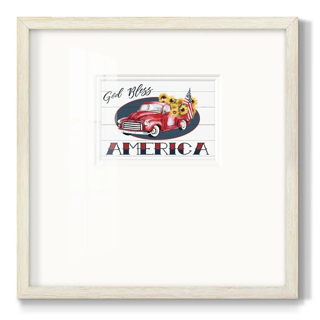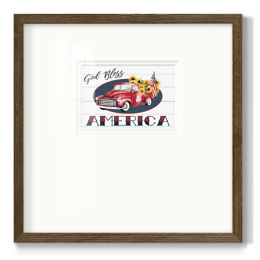 God Bless America TruckPremium Framed Print A framed cold pressed paper print featuring superior double matting and quality frame. 2 SIZES AVAILABLE 16''X16''' - Overall Size 20''X20''' - Overall Size Each piece is made to order. Each piece comes with hanging hardware. Made in the USA Ready to Hang Giclee Paper Print Plexiglass Beveled Matt Board Double Matte Board