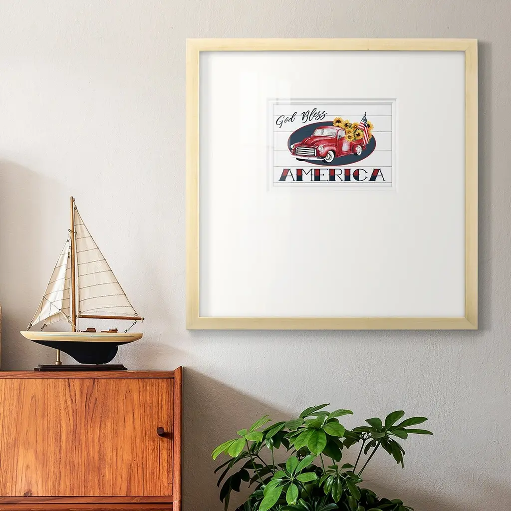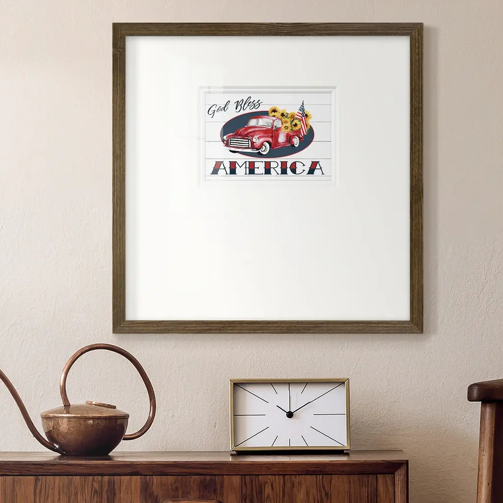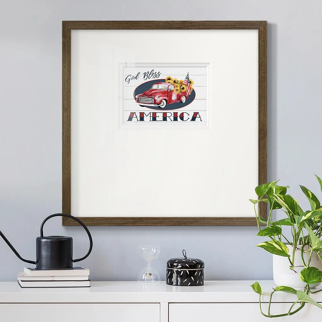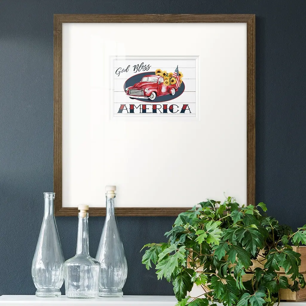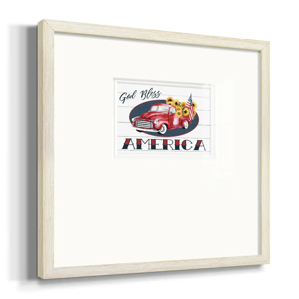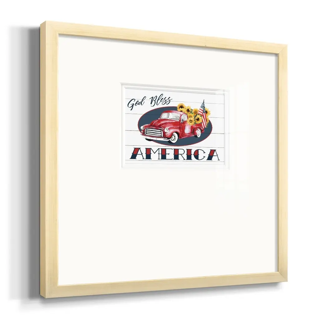 God Bless America TruckPremium Framed Print A framed cold pressed paper print featuring superior double matting and quality frame. 2 SIZES AVAILABLE 16''X16''' - Overall Size 20''X20''' - Overall Size Each piece is made to order. Each piece comes with hanging hardware. Made in the USA Ready to Hang Giclee Paper Print Plexiglass Beveled Matt Board Double Matte Board