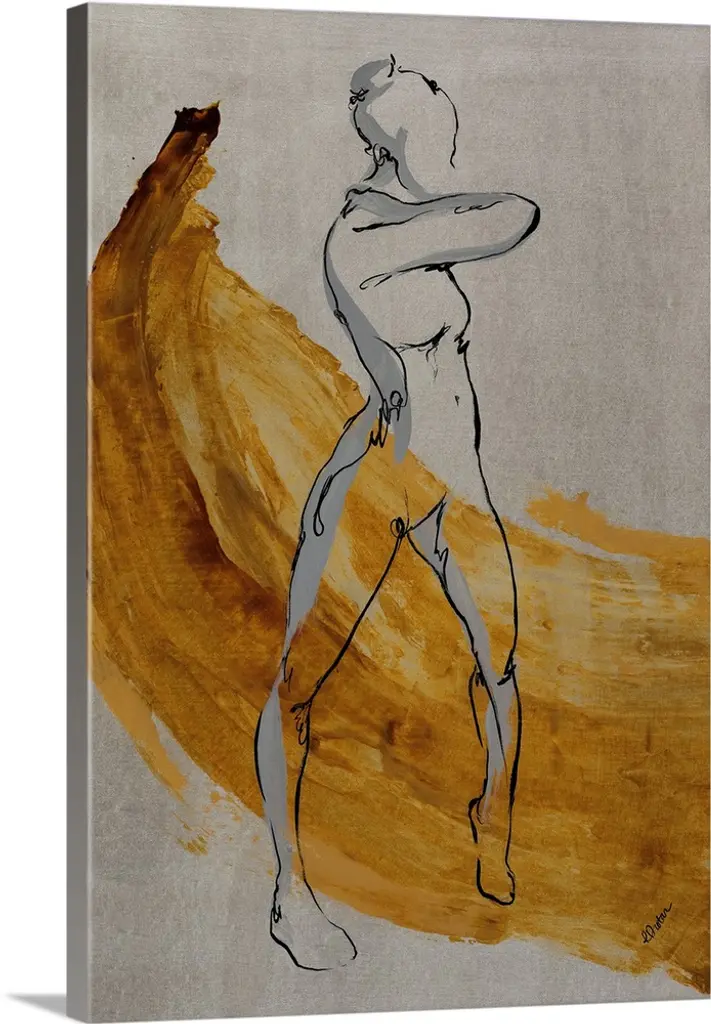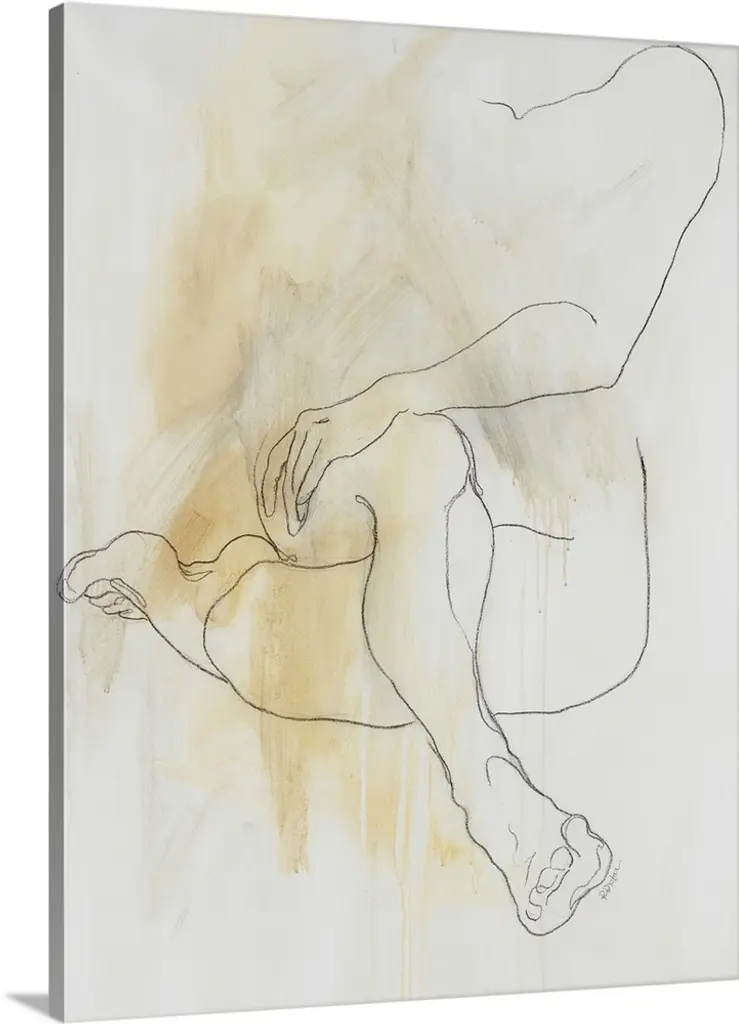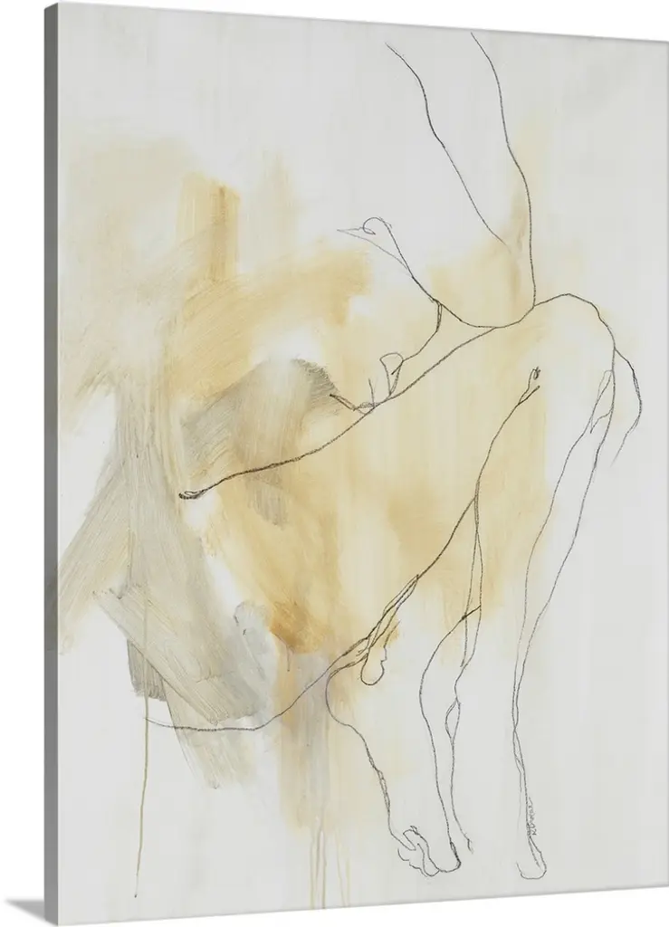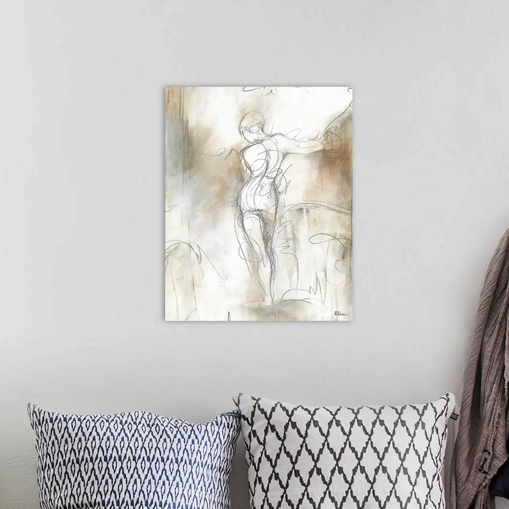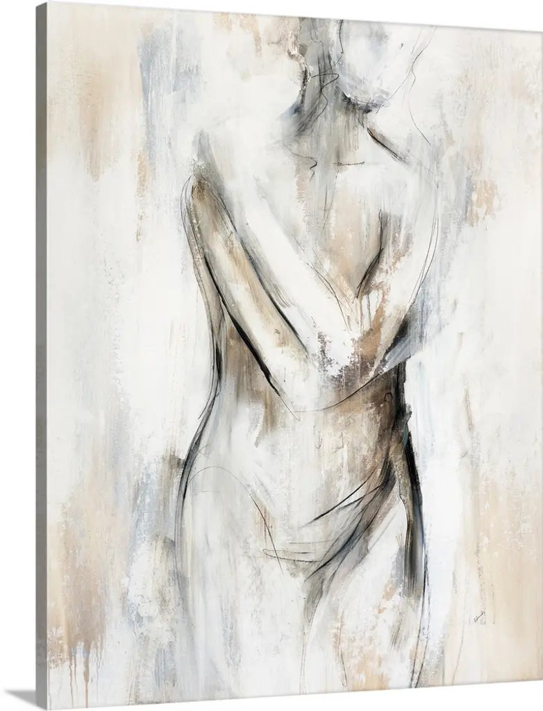 Contemporary abstract painting using neutral tones surrounding a sketch lined female form.