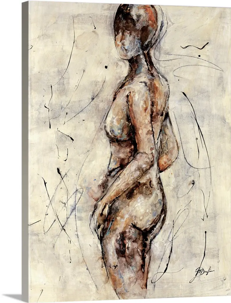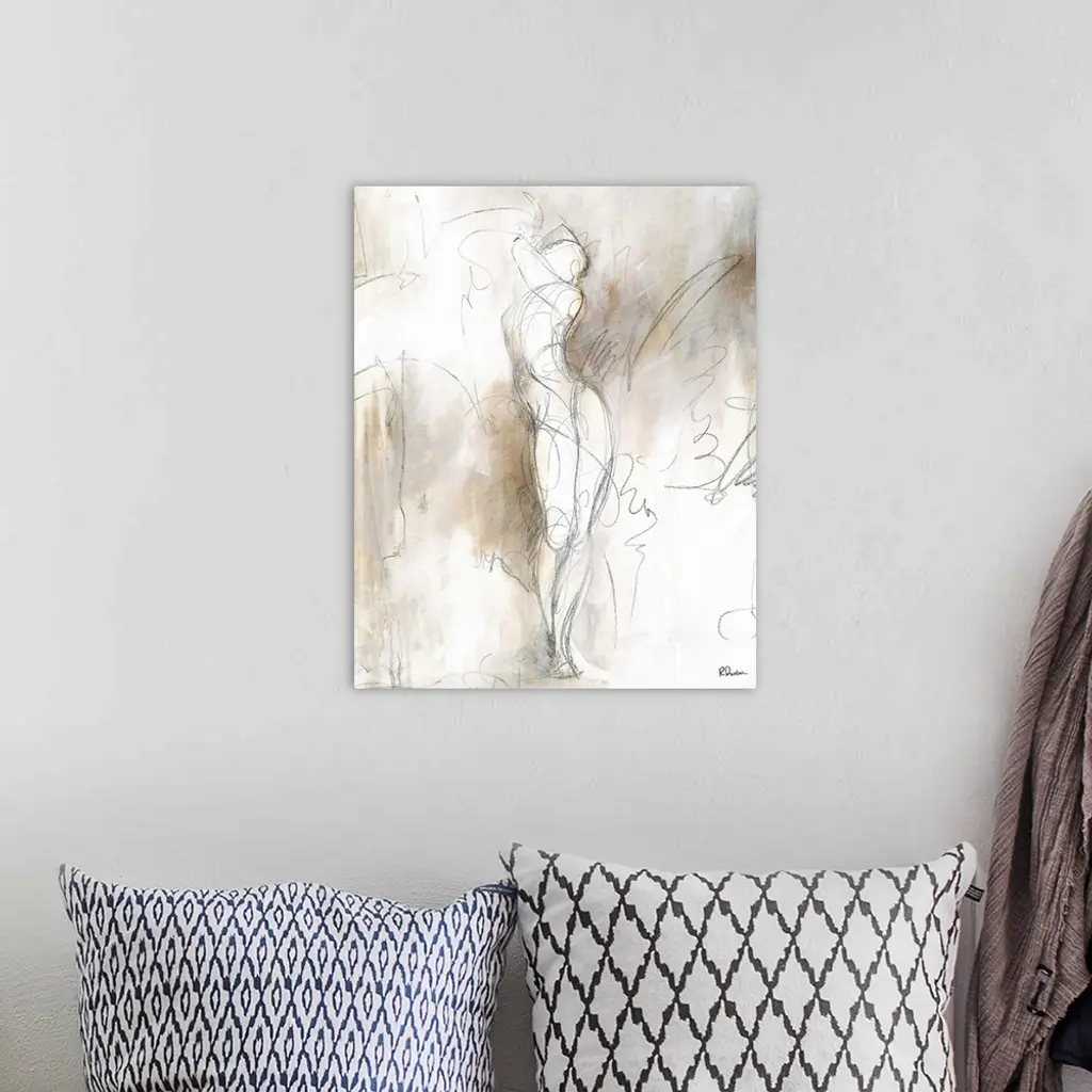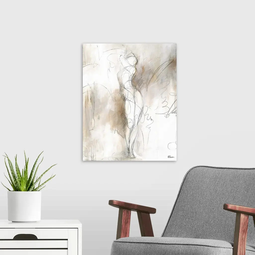 Contemporary abstract painting using neutral tones surrounding a sketch lined female form.